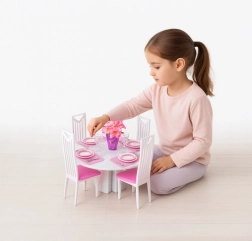 Deze elegante eetkamer‑set voor poppen brengt realistisch tafelen in miniatuur – van borden en bestek tot glazen en een bloemenversiering. Kinderen dekken eenvoudig een tafel voor vier poppen en verzinnen eindeloos veel verhaaltjes. De lichte en stabiele constructie van duurzaam plastic zorgt voor een lange levensduur, ook bij dagelijks spelen.