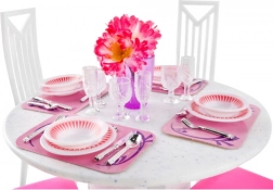 Ronde tafel, vier stoelen en een volledige set servies en bestek. Alles op elkaar afgestemd in roze‑wit voor realistisch tafelen en een mooie presentatie.
