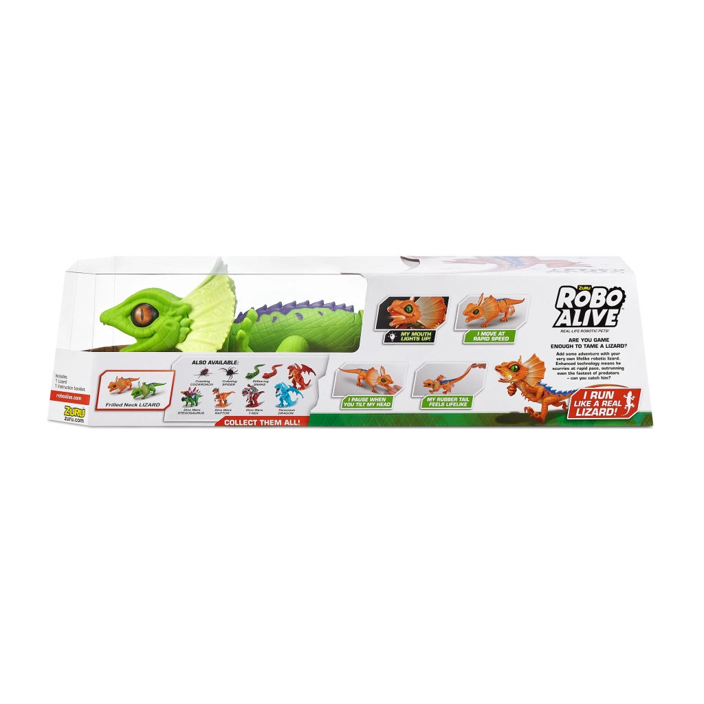 Ontdek het plezier met de robotische hagedis ROBO ALIVE, die eruitziet en beweegt als een echte. Deze oranje hagedis met blauwe details kan rennen als een echte, lopen en de kop bewegen, en het realistische design met nekkraag zal zowel jonge als oudere dierenliefhebbers verrassen.