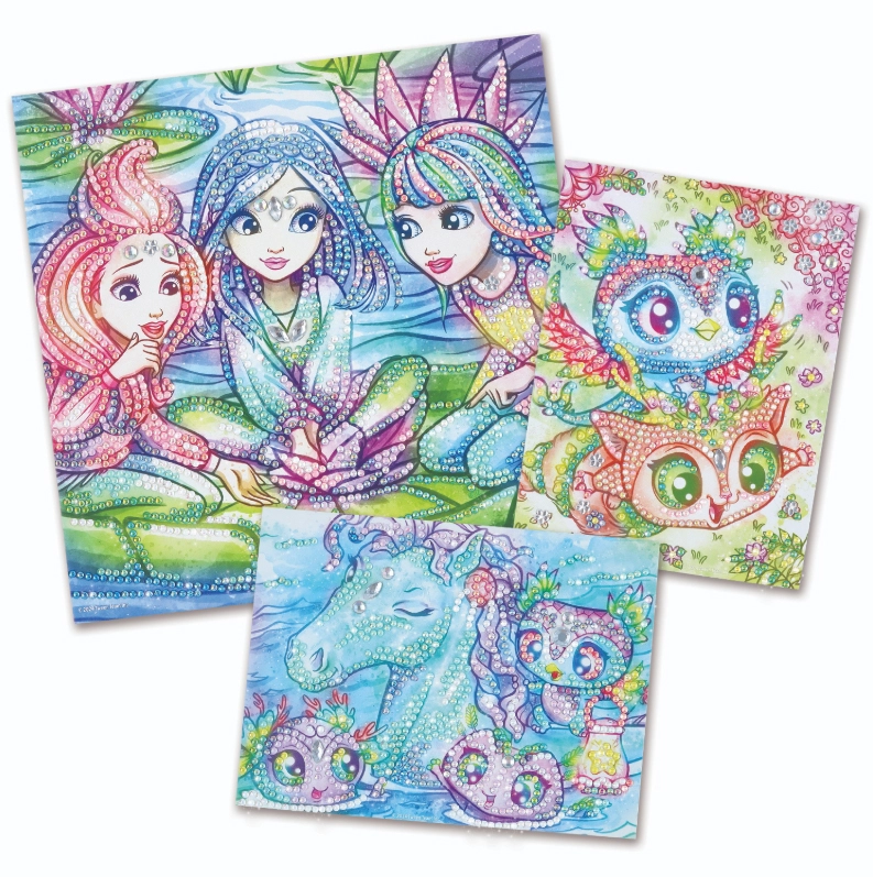 In de verpakking vind je een complete uitrusting: een steentjes-applicator, 3 doeken met voorbeeld, ca. 4500 steentjes, een vakje voor sorteren en een kleurrijke handleiding. Het knutselen is intuïtief, rustgevend en bevordert concentratie en geduld.