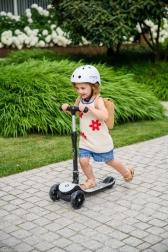 De MoMi San is de ideale eerste step voor jonge rijders vanaf ca. 3 jaar. Drie wielen zorgen voor uitstekende stabiliteit, het lage gewicht van 2,7 kg maakt hanteren eenvoudig en de voetrem biedt zekerheid bij het stoppen. Dankzij de LED-wielen is rijden niet alleen veilig, maar ook leuk.
