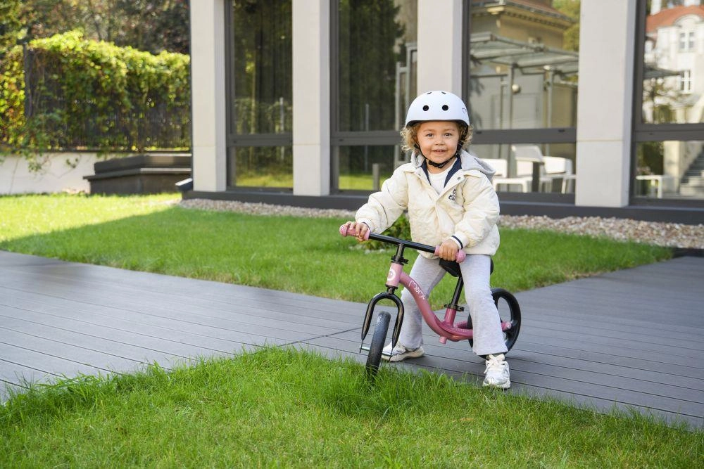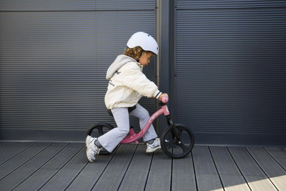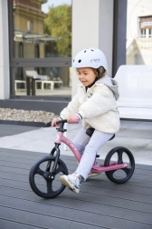 De hoogte van zadel en stuur stel je zonder gereedschap in enkele seconden af, zodat de loopfiets gemakkelijk meegroeit met het kind. Wielen van veerkrachtig thermoplastisch rubber (TPR) dempen vibraties en zorgen voor stil, comfortabel rijden op stoep én in de tuin. Het ontbreken van een stuurvergrendeling verbetert de wendbaarheid en bij een val klapt het stuur in, wat de veiligheid vergroot.