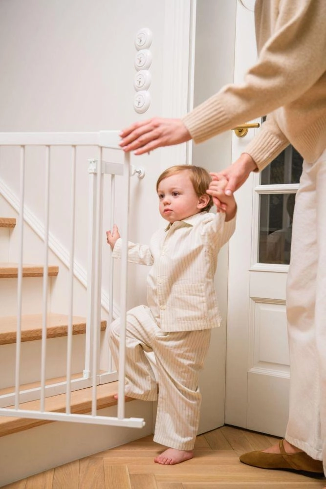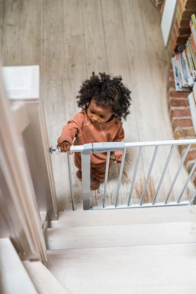 De basisbreedte van 75–82 cm en de meegeleverde verlengstukken van 7 cm en 14 cm maken uitbreiding tot 103 cm mogelijk. Het hekje opent in beide richtingen, heeft praktische vergrendeling en blijft bij 90° open voor een comfortabele doorgang. Het dubbele vergrendelingssysteem voorkomt dat kinderen het zelfstandig openen.