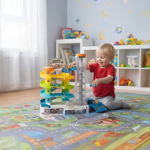 Uitgebreide meerlaagse speelset met vloeiende afdalingen en parkeervakken stimuleert de verbeelding, fijne motoriek en spel met meerdere kinderen tegelijk.