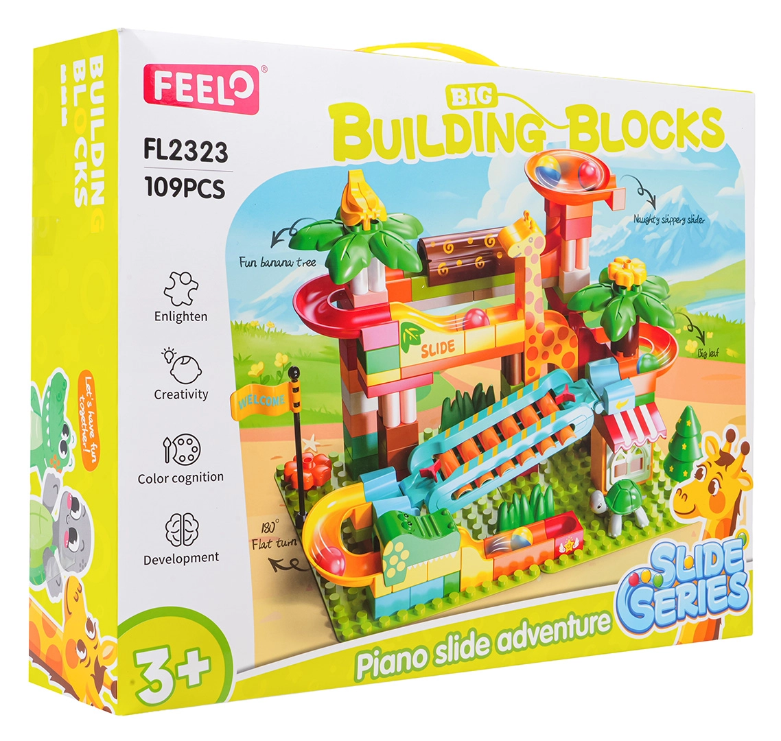 Deze creatieve bouwset brengt een safari-sfeer naar de kinderkamer: palmbomen, dieren en een huisje worden gecombineerd met een doordachte knikkerbaan met glijbanen, trechters en een pianoelement – wanneer de knikkers over de cimbaaltjes rollen, ontstaan vrolijke melodieën. Een stabiele basis en eenvoudig vastklikken van de onderdelen garanderen zorgeloos bouwen en spelen.