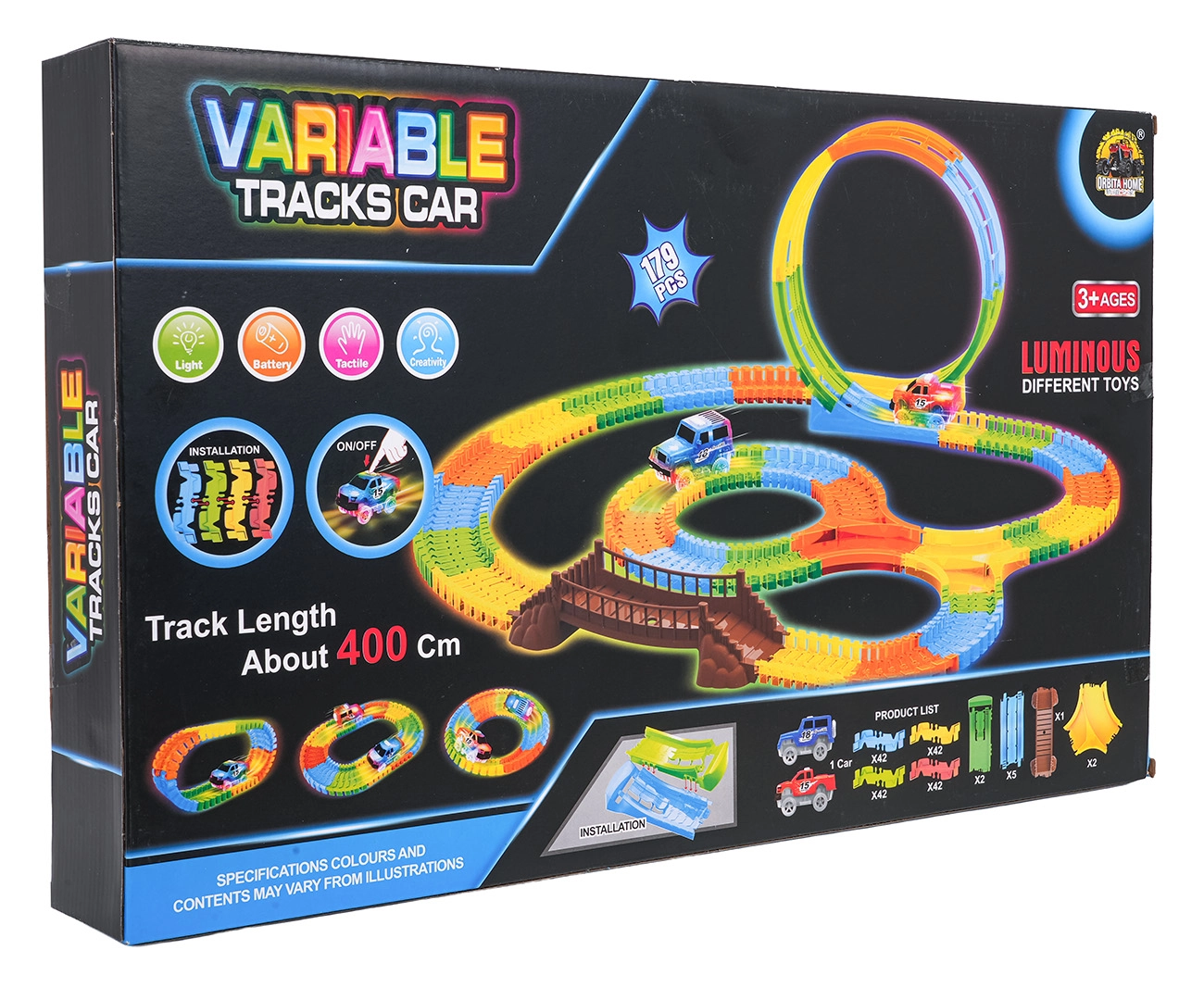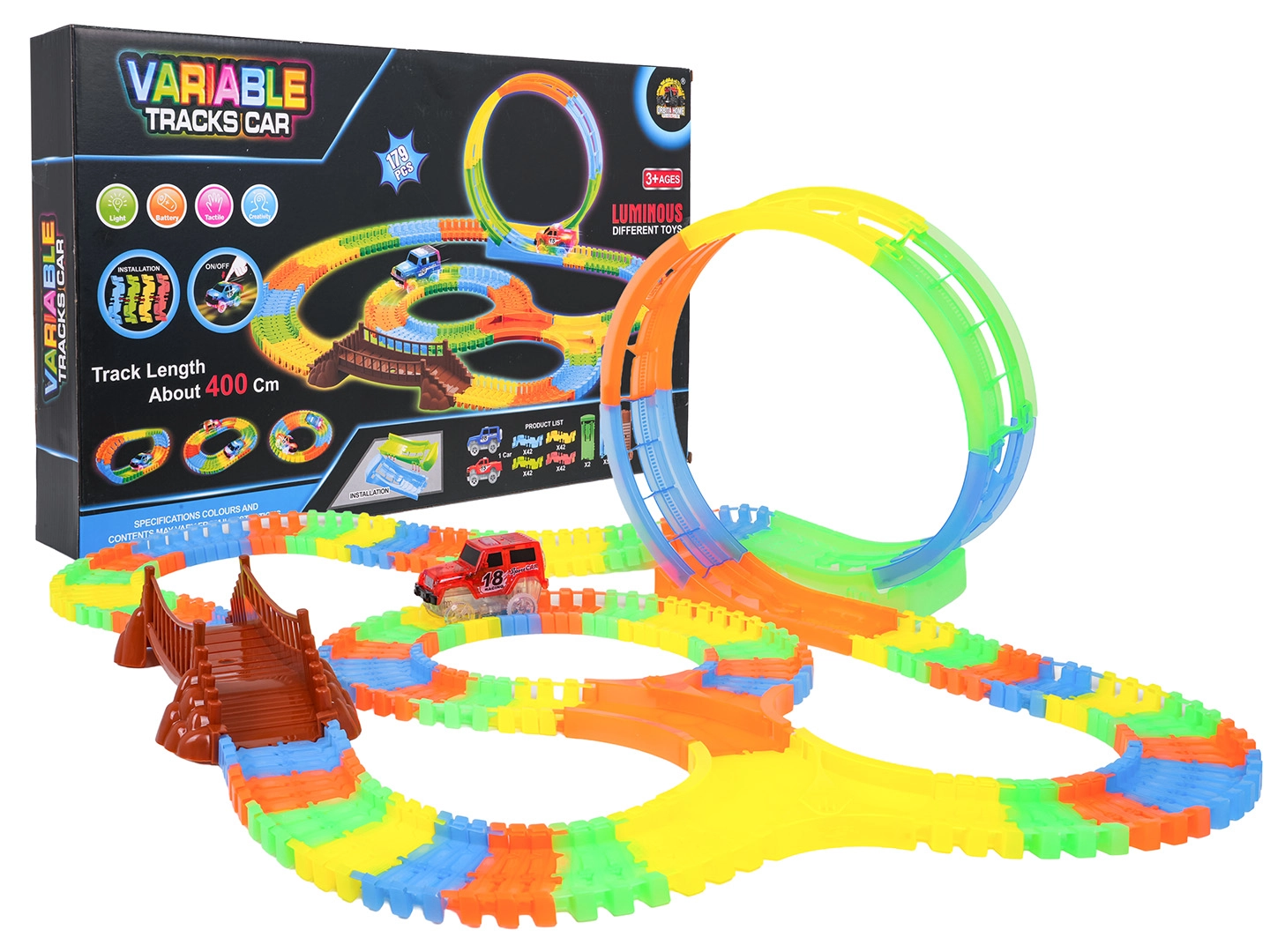 Deze kleurrijke racebaan is leuk voor kinderen vanaf 3 jaar. Dankzij de flexibele segmenten bouw je in een mum van tijd rechte stukken, bochten, een brug en een grote verticale lus. Het fluorescerende ontwerp zorgt voor een gloeieffect in het donker, terwijl het LED-autootje over de baan rijdt en een lichtspoor achterlaat.