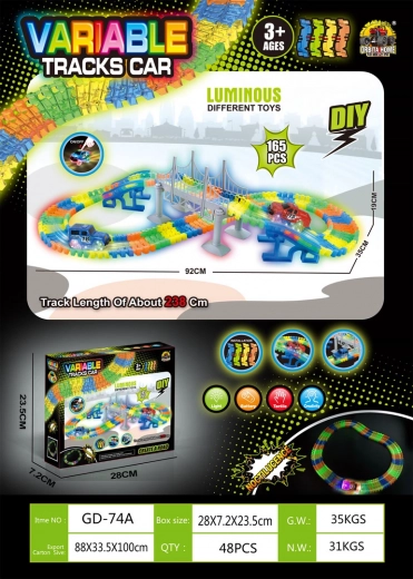 Creëer je eigen racewereld met de VARIABLE-racebaan met een lengte tot 238 cm. De onderdelen zijn flexibel en eenvoudig te koppelen, zodat kinderen de baan snel kunnen veranderen en experimenteren met nieuwe combinaties. De fluorescerende uitvoering zorgt ervoor dat de afzonderlijke delen in het donker oplichten, en de rit van de auto met LED-lichten is een echte lichtshow.