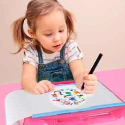 De set bevat 6 motievenvellen (in totaal 72 afbeeldingen), een set met 12 kleurpotloden en 12 stiften. De tafel heeft geïntegreerde opbergvakken en een transparant veiligheidsafdekplaatje. Ideaal voor kinderen vanaf 3 jaar, stimuleert fijne motoriek, concentratie en fantasie.
