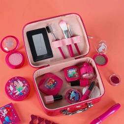 Stijlvol kinderkoffertje met cosmetica voor kinderen vanaf 3 jaar biedt veilige, creatieve pret zonder rommel. Alle onderdelen zijn slechts imitaties van echte make-up – oogschaduw en poeders van gekleurd foam, lege mascara – zodat kinderen zonder risico kunnen spelen. Het koffertje van lederlook-materiaal heeft een praktisch handvat, dubbele ritsen en stabiele metalen pootjes voor comfortabel dragen en opbergen.