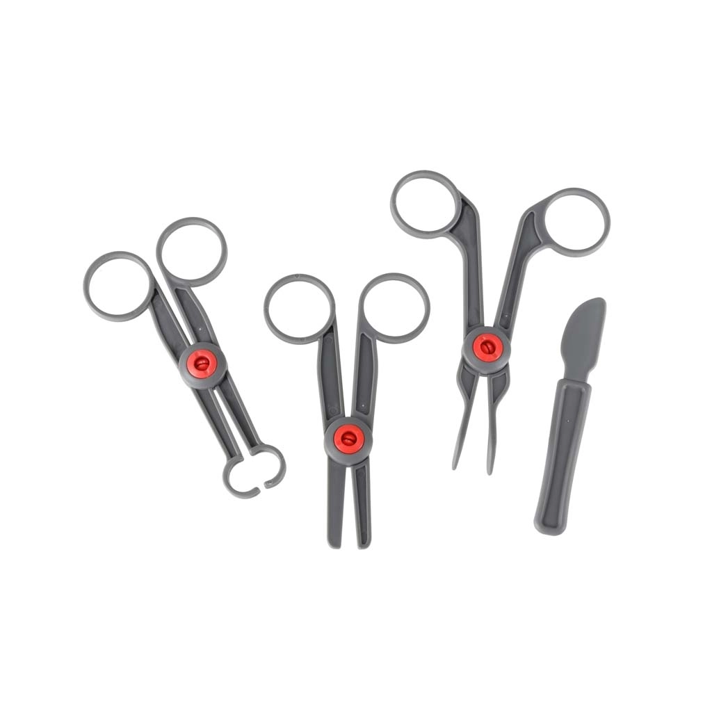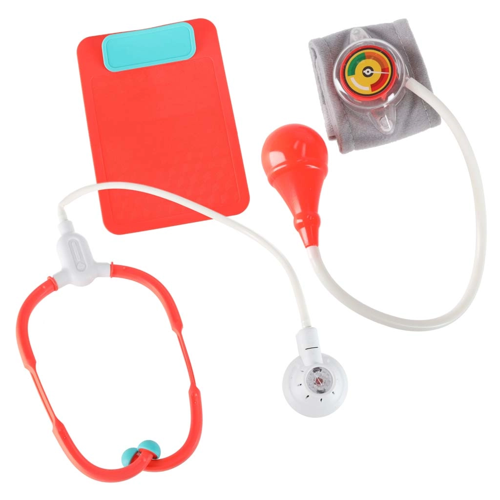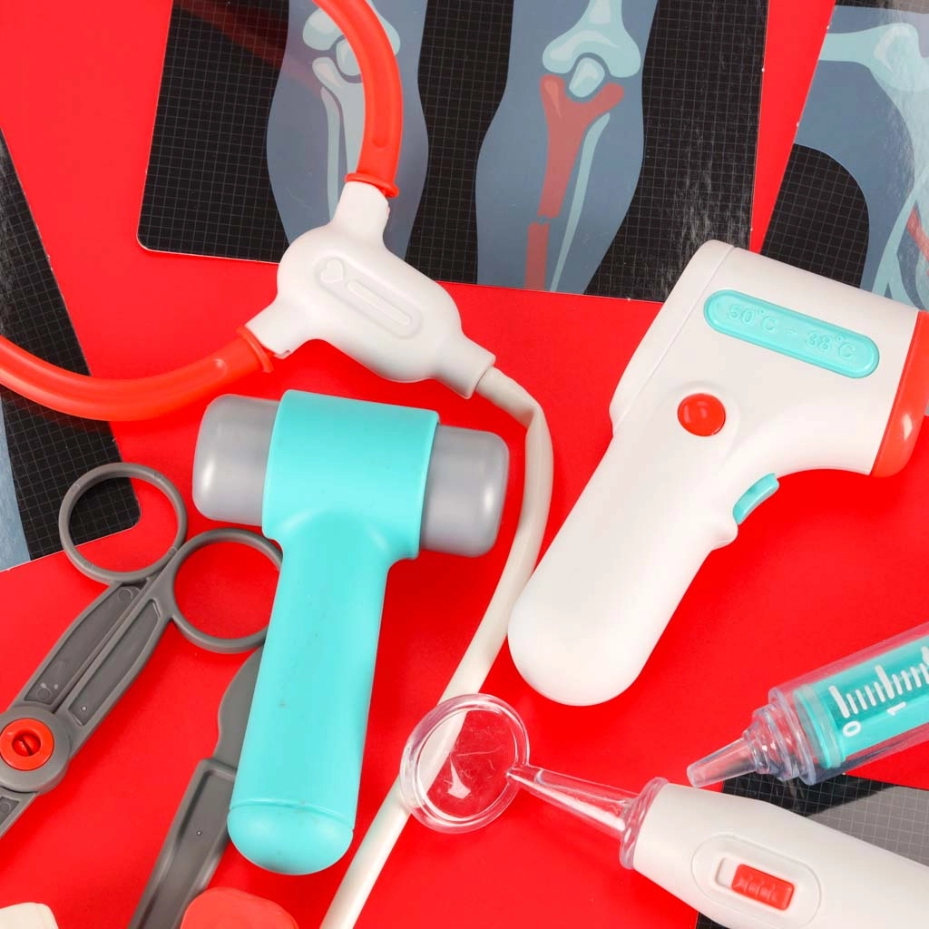 In de set vind je alles voor kleine dokters: een stethoscoop (licht en geluid), bloeddrukmeter, echo (licht), zaklamp (licht), elektronische thermometer (licht en geluid), tandendoscoop (licht), pulsoximeter, neurologisch hamertje, schaar, tang en pincet, scalpel, spuit, medicijnendoos, schrijfplaat met clip en 6 röntgen- en ECG-opnames.