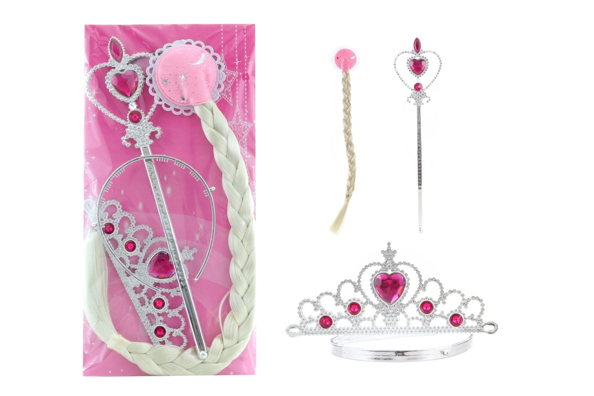 • Complete prinsessenuitrusting – kroon, scepter en lange blonde vlecht in één verpakking.