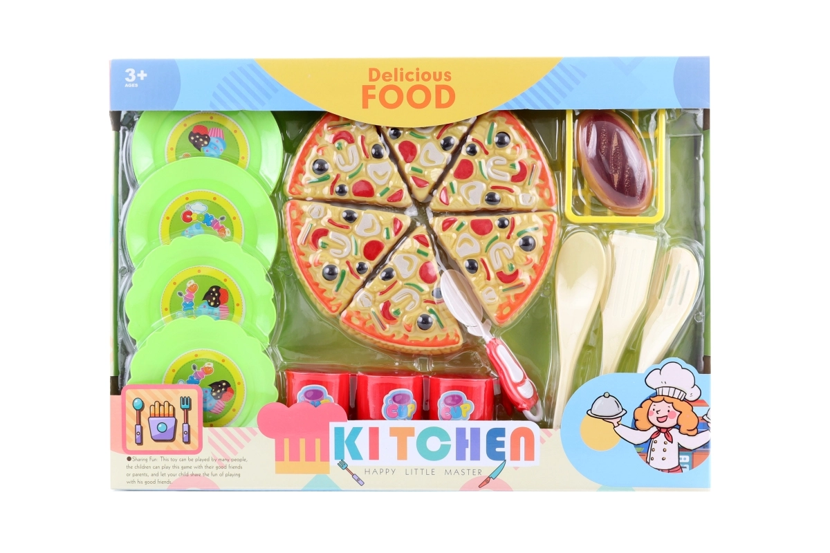 Leuke kinderset voor kleine koks: plastic pizza verdeeld in 6 stukken met bordjes, bekers en keukengerei voor voorbereiding en serveren. Ideaal voor keukenspel, stimuleert creativiteit, samen spelen en fijne motoriek. Verpakt in een doos, geschikt voor kinderen vanaf 3 jaar.