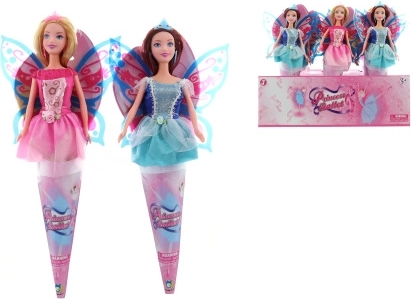 Elegante accessoires zoals een kroontje en oorbellen geven de pop een sprookjesachtige touch. De pop is gemaakt van duurzaam kunststof, terwijl de kegel van papier is, waardoor hij perfect is als cadeauverpakking.