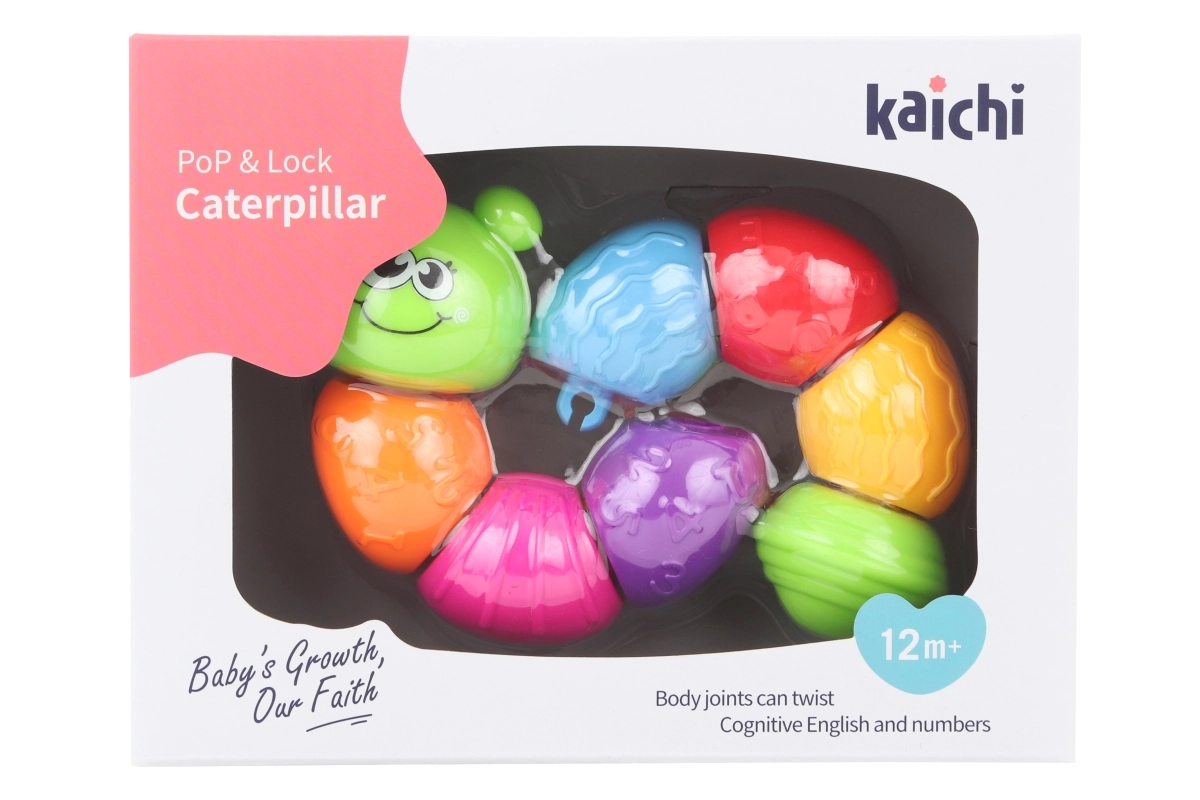 Deze koppelbare rups is een geweldige hulp bij de ontwikkeling van de fantasie en vaardigheden van kinderen. De afzonderlijke segmenten (ca. 4 cm) kunnen gemakkelijk aan- en losgekoppeld worden, zodat kinderen verschillende vormen en lengtes kunnen creëren. Het eindsegment met rammelaar voegt een geluidseffect toe dat de zintuiglijke waarneming stimuleert en de aandacht vasthoudt.