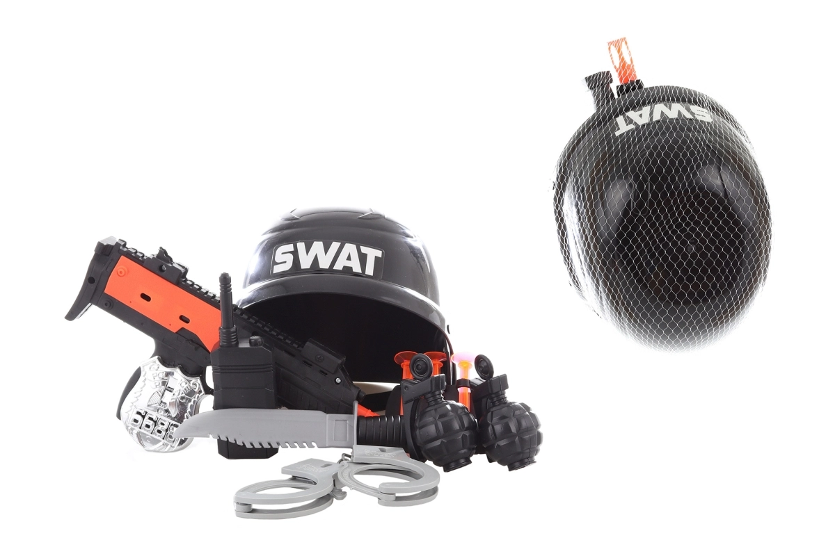 Complete politieset voor kleine helden met helm, pistool, kogels, handboeien, mes, walkietalkie, badge en granaten. Ideaal voor creatief spel en het ontwikkelen van de fantasie. Licht kunststof materiaal, rijk aan accessoires en veilige uitvoering voor kinderen vanaf 3 jaar.