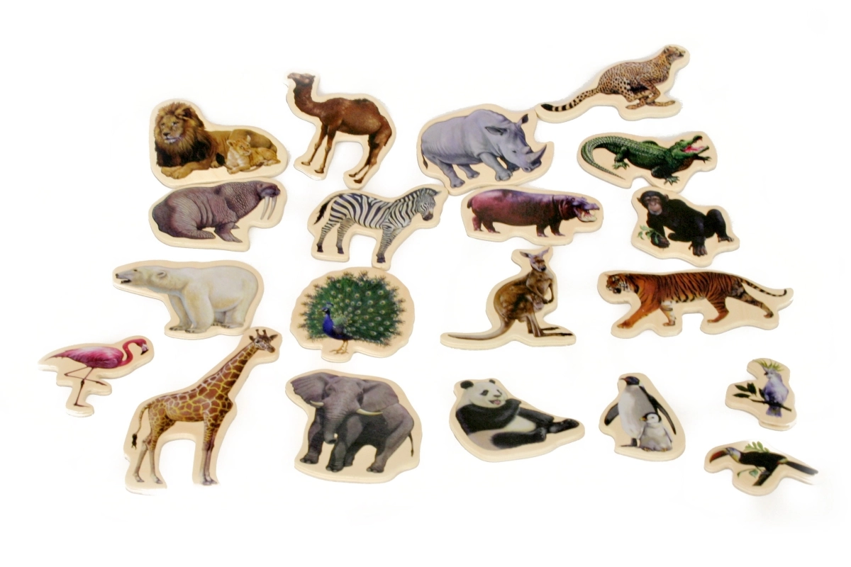 Duurzame houten figuren met realistische opdruk zijn bestand tegen dagelijks gebruik en liggen prettig in kinderhanden.
