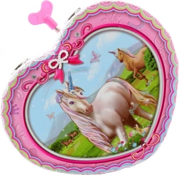 Deze charmante muziekjuwelendoos in hartvorm betovert met haar roze design met eenhoorn en fijne decoratieve details. Na het opwinden begint bij het openen van het deksel de ballerina voor het spiegeltje te draaien en start de melodie, die bij elke keer opbergen van sieraden een magische sfeer creëert.