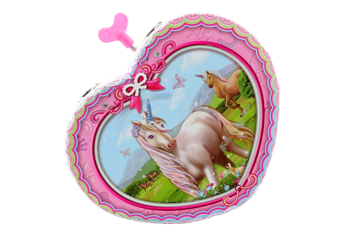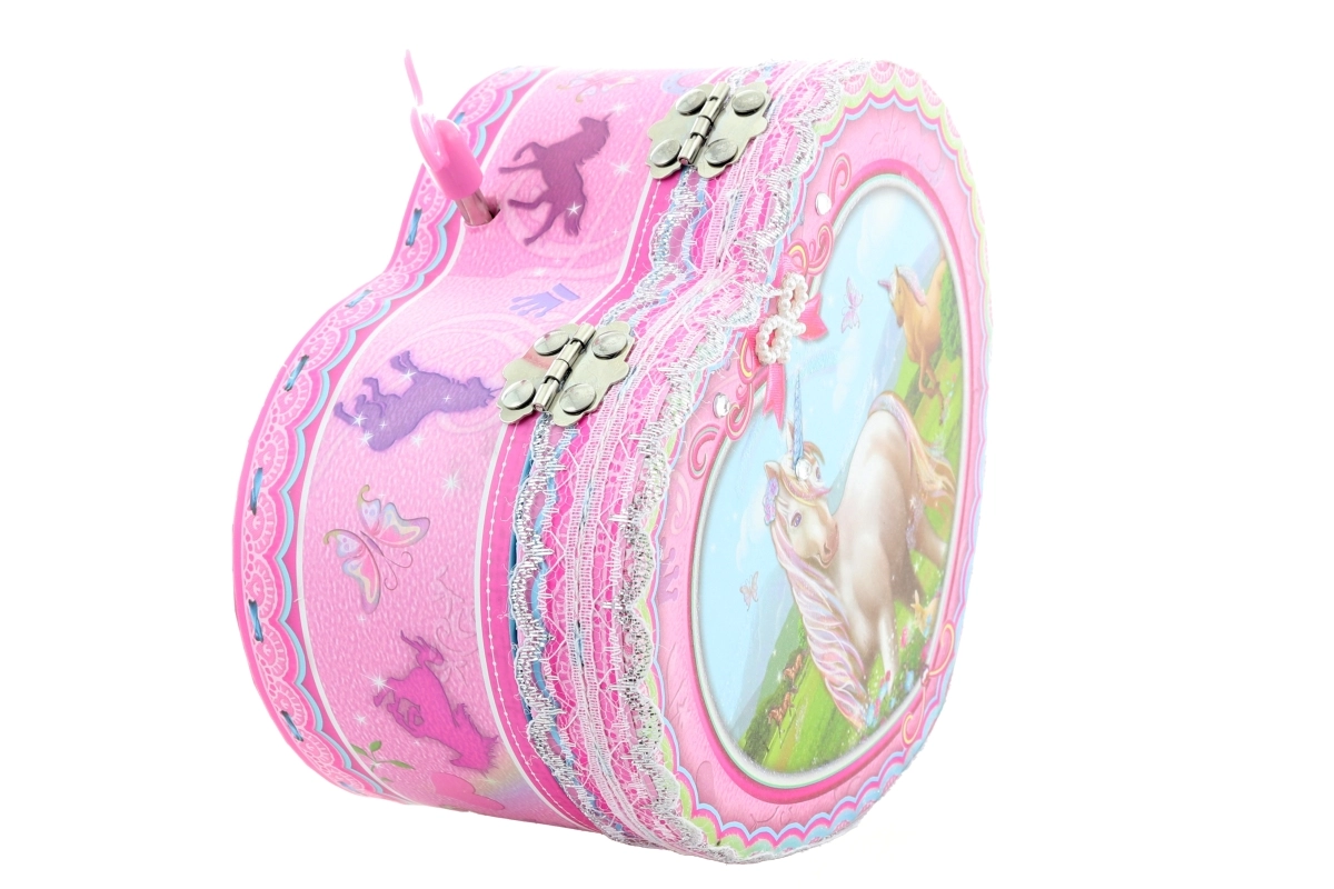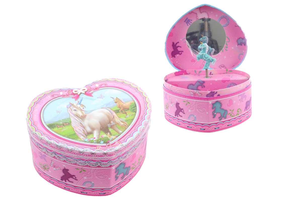 Een betoverende roze juwelendoos in hartvorm met een eenhoornmotief die zowel kleine als grote liefhebbers van schattige accessoires zal verrassen. Na het opwinden begint binnen, voor het spiegeltje, de ballerina te draaien en klinkt een zachte melodie. Ideaal voor het opbergen van kleine sieraden en schatten, met een decoratieve afwerking die elke kamer siert. Muziekmechanisme, spiegeltje, draaierende ballerina, eenhoorndesign en compacte afmetingen.