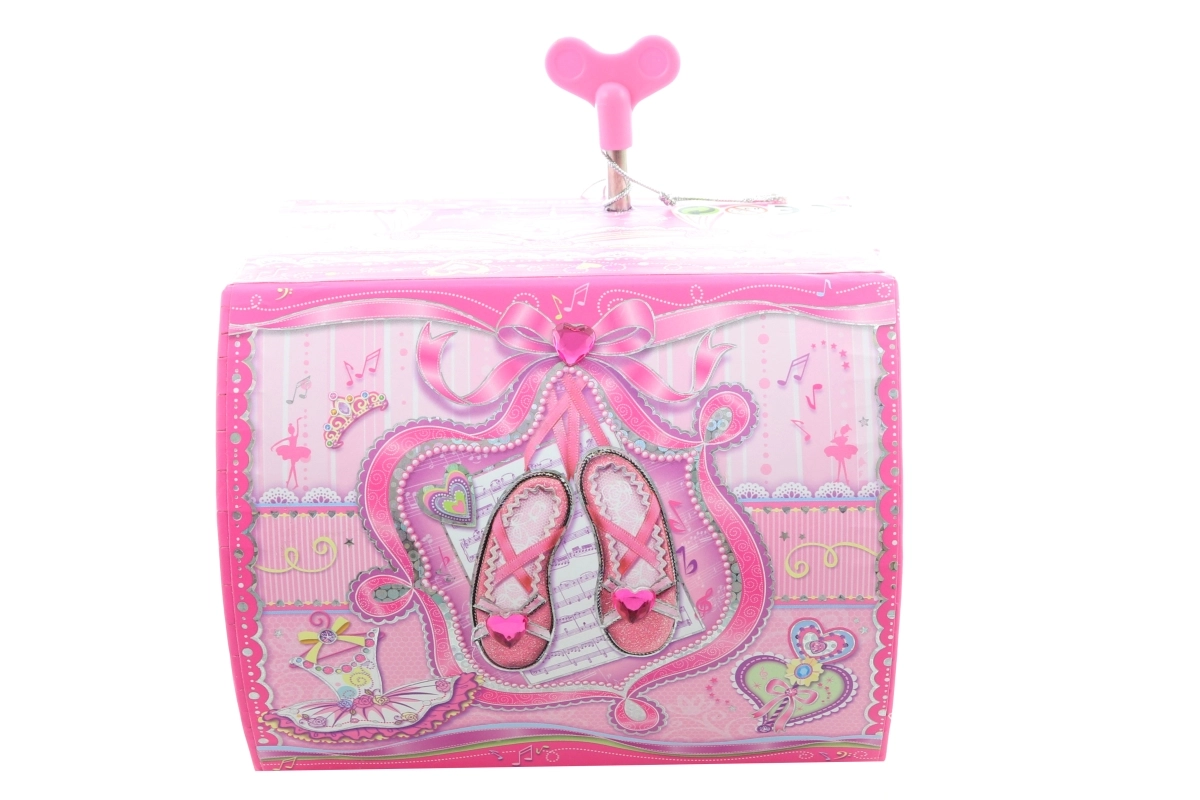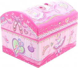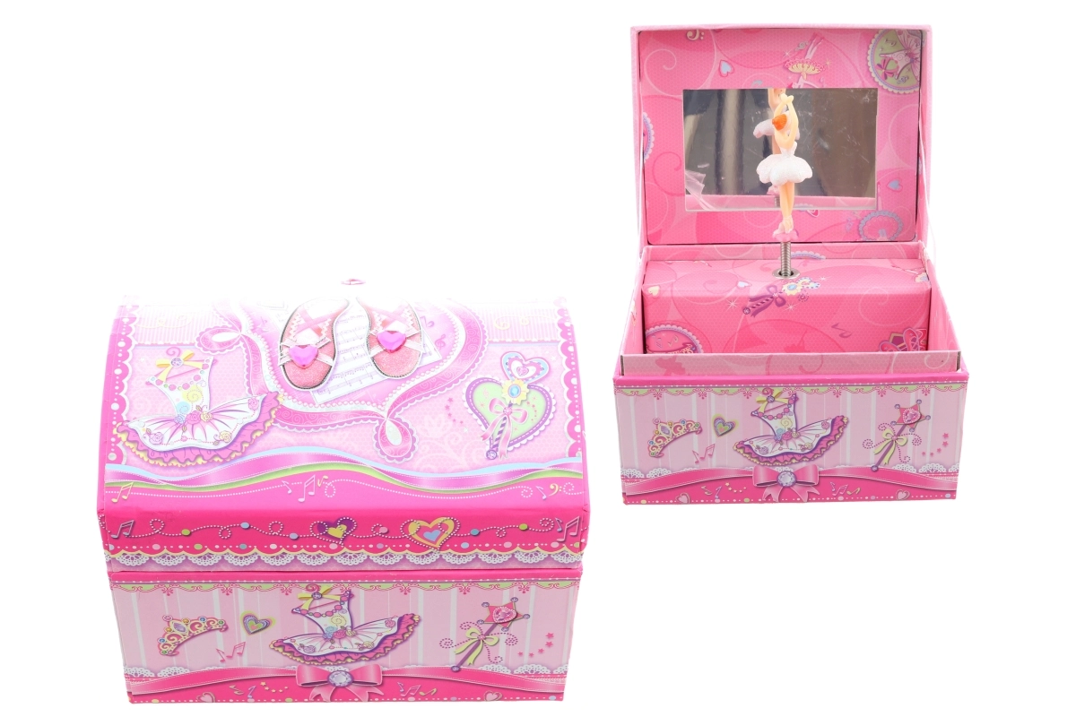 Dit charmante juwelendoosje in de vorm van een kistje is de ideale plek om ringen, oorbellen en andere hebbedingen op te bergen. Na het opdraaien van het sleuteltje en het openen van het deksel draait de ballerina voor het spiegeltje en klinkt er een melodie die een magische sfeer creëert.