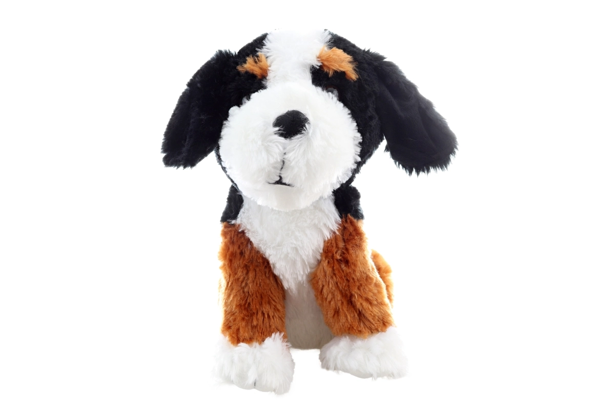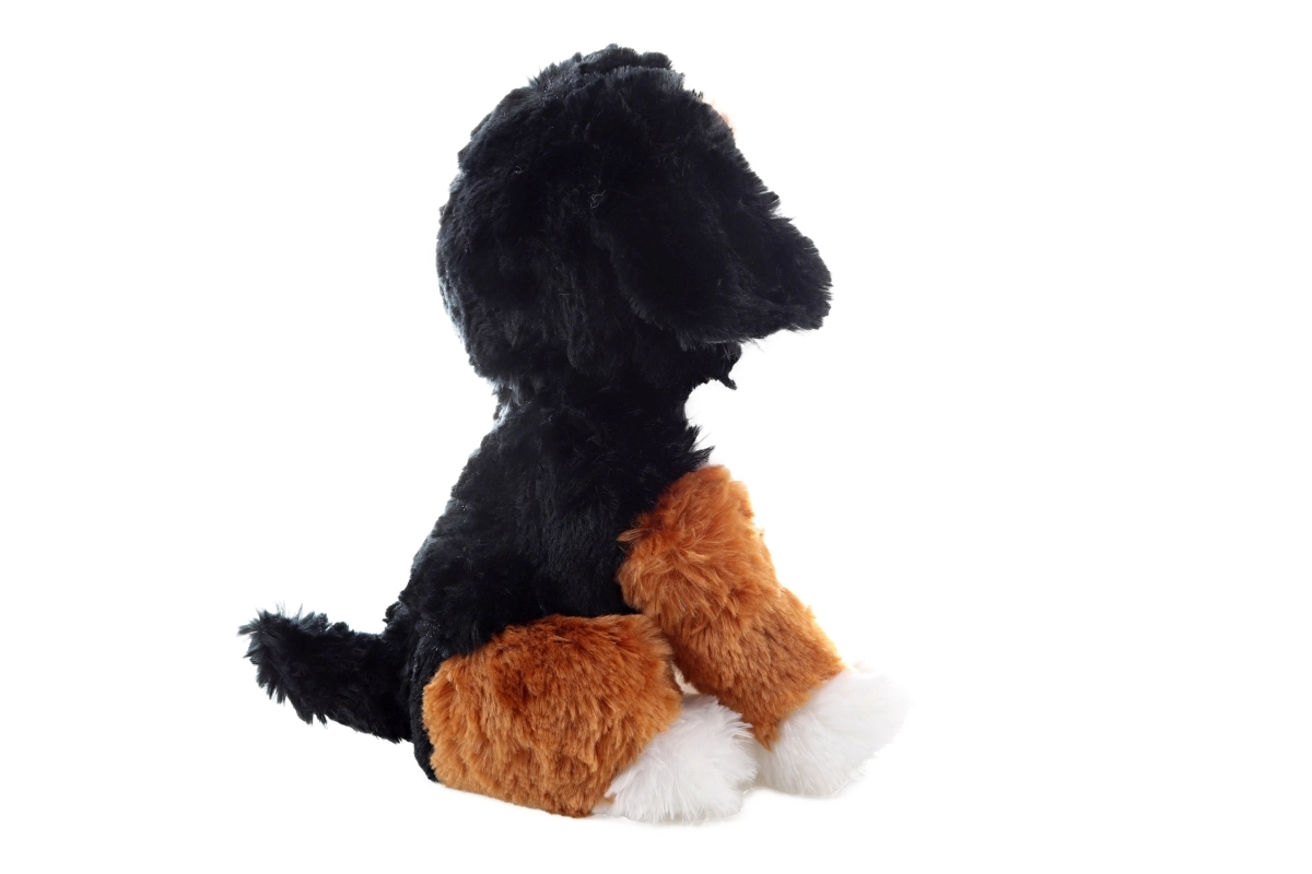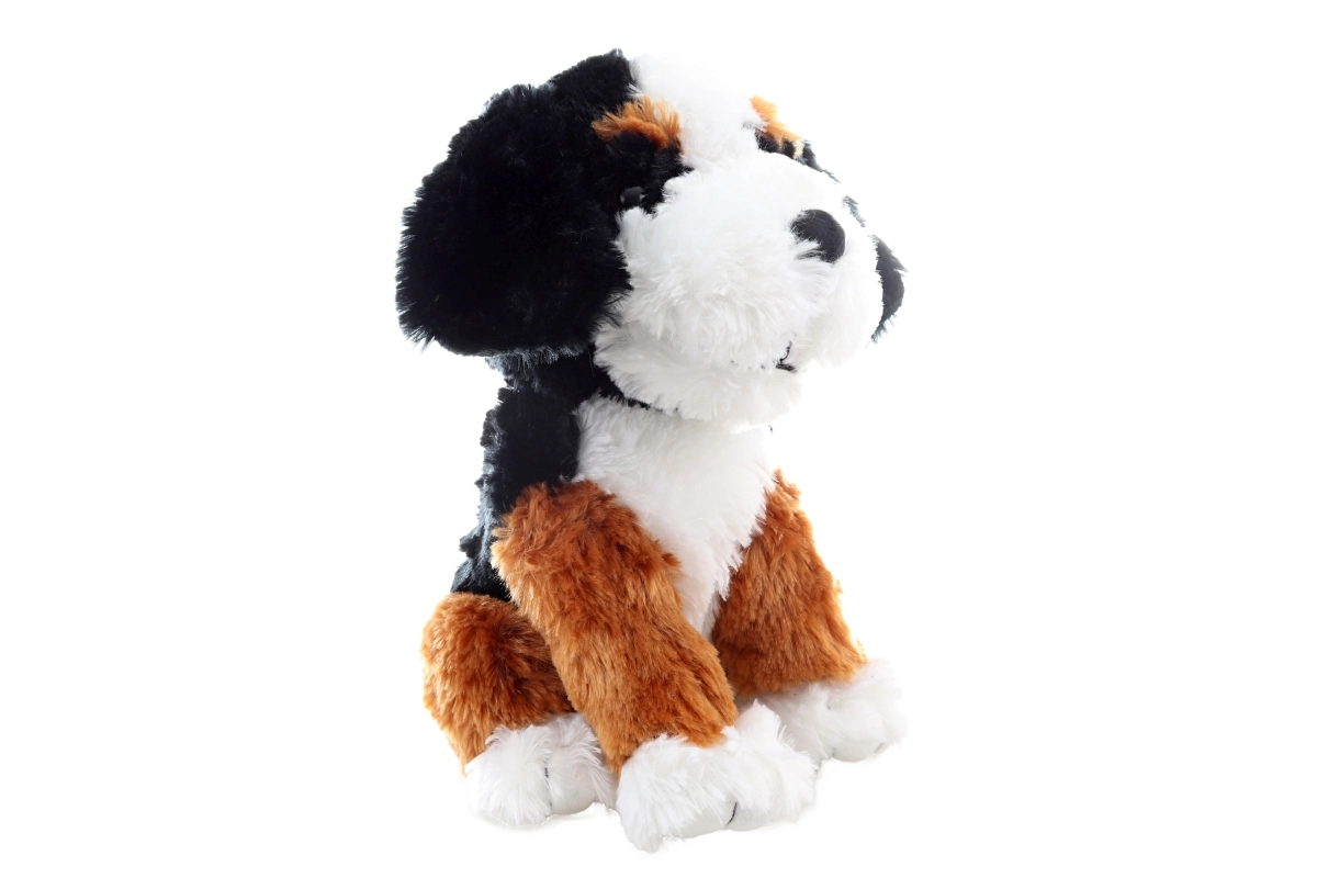 Deze pluchen Berner sennenhond is gemaakt van extra zacht materiaal dat uitnodigt om te aaien. De zittende positie en realistische driekleurige vacht in zwart, wit en bruin geven hem een schattige en vriendelijke uitstraling die prachtig staat in de kinderkamer.