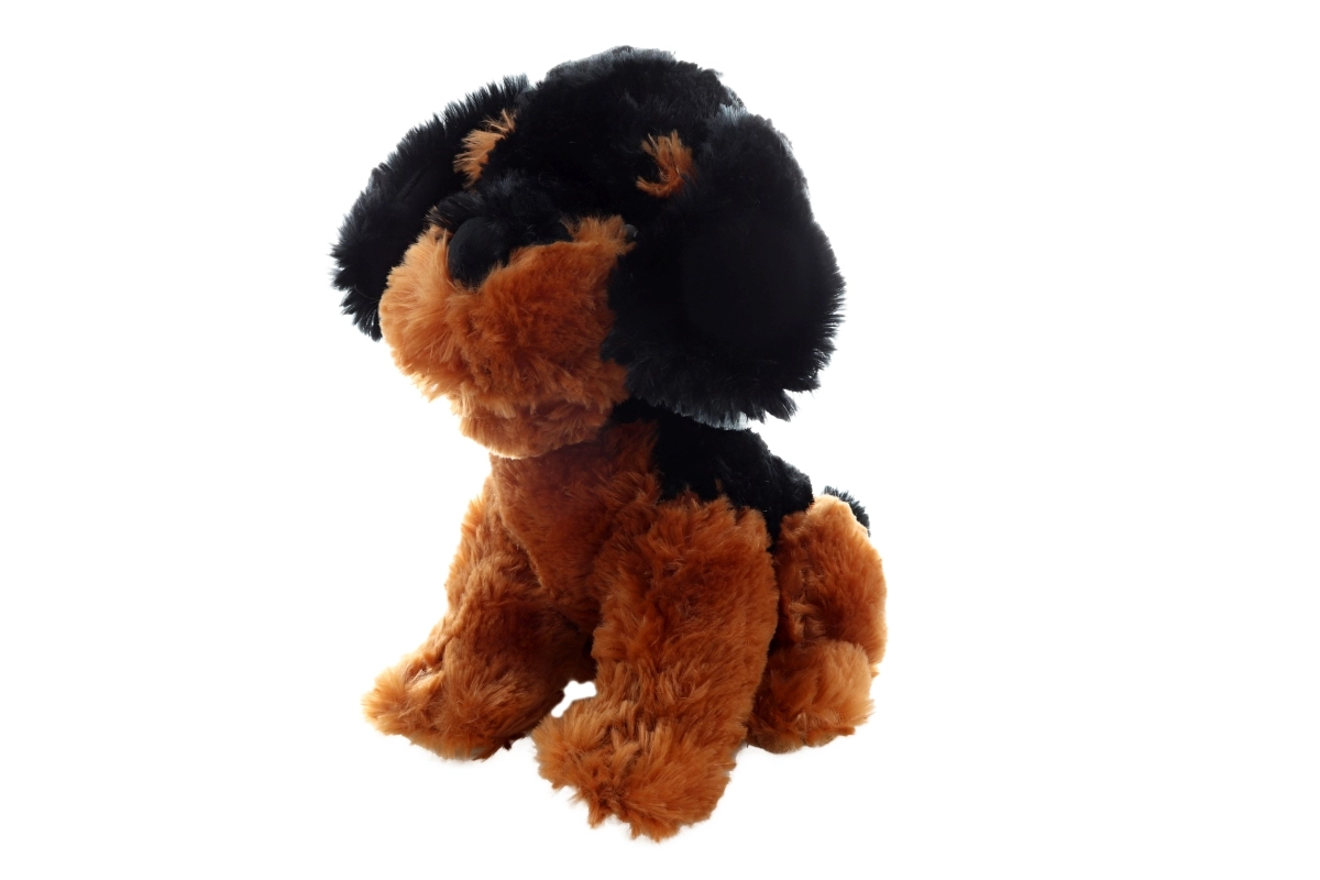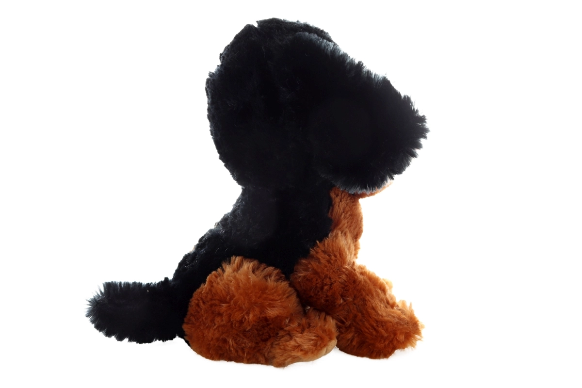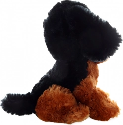 Dit donkere pluchen hondje in zittende houding betovert met zijn zachte, fluffy vacht en vriendelijke uitstraling. Het is gemaakt van hoogwaardige, aangenaam aanvoelende materialen die uitnodigen tot knuffelen en voor comfort zorgen bij het inslapen.
