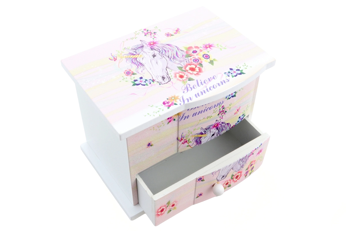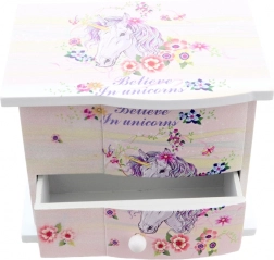Een betoverende houten juwelendoos met een eenhoornmotief die elke kleine diva zal verrukken. Bij het openen begint een hartje te draaien en klinkt een zachte melodie. Met binnenspiegel, een praktische lade voor kleine schatten en een slotje met sleuteltje. Ideaal cadeau voor kinderen vanaf 3 jaar. Muziekmechanisme, spiegel, lade voor sieraden, kinderlijk design met eenhoorn.