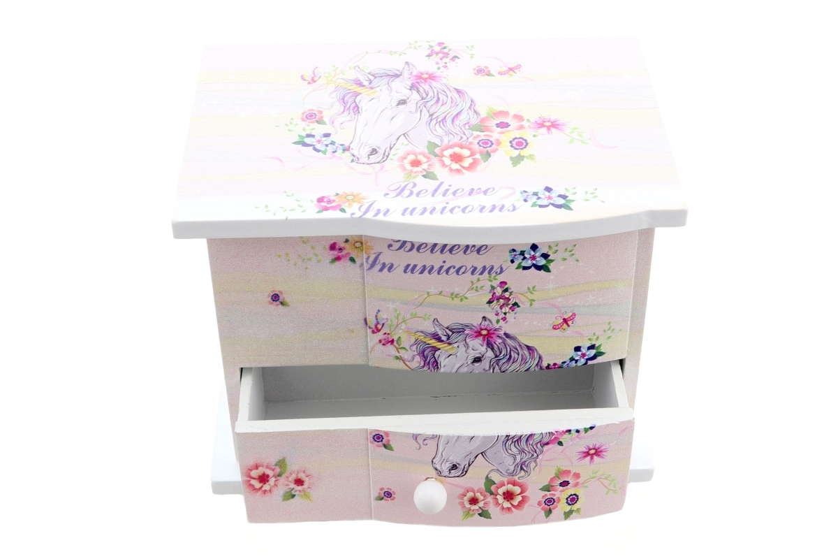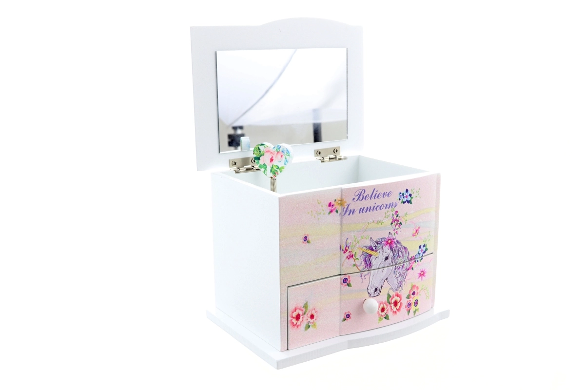 Deze charmante houten juwelendoos met eenhoornmotief beschermt kinderschatten als ringetjes, armbanden en geheime kleinigheden. Bij het openen van het deksel begint een hartje te draaien en klinkt er zachte muziek, wat bij elk gebruik een glimlach tovert. Bovenin zit een praktische spiegel voor het snel passen van sieraden, onderin vind je een lade voor extra kleinigheden.