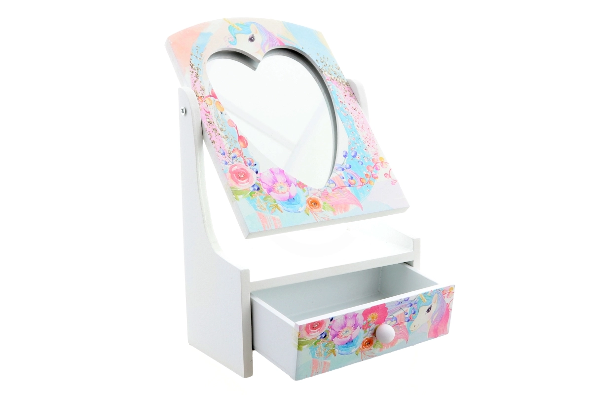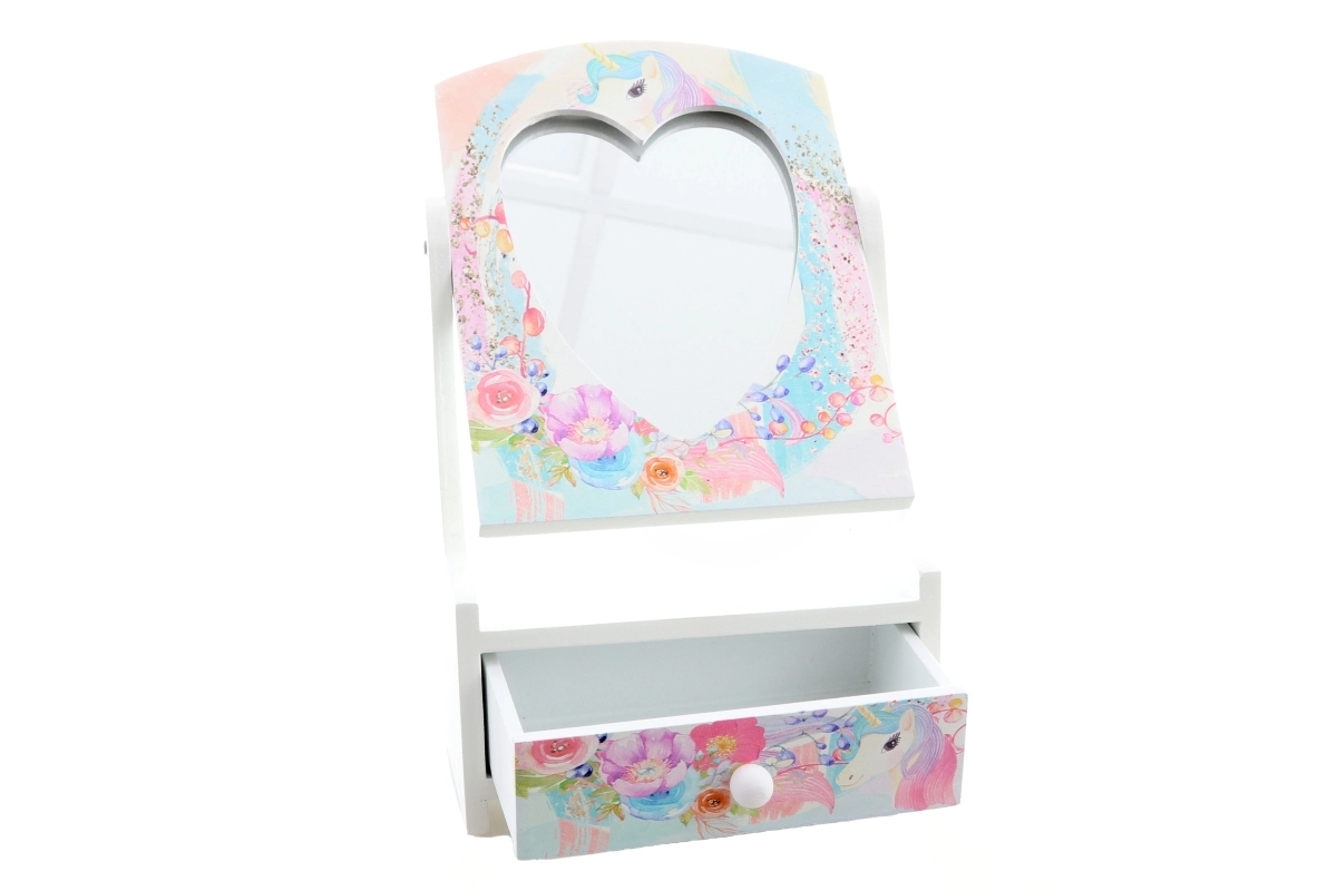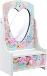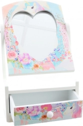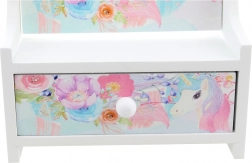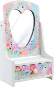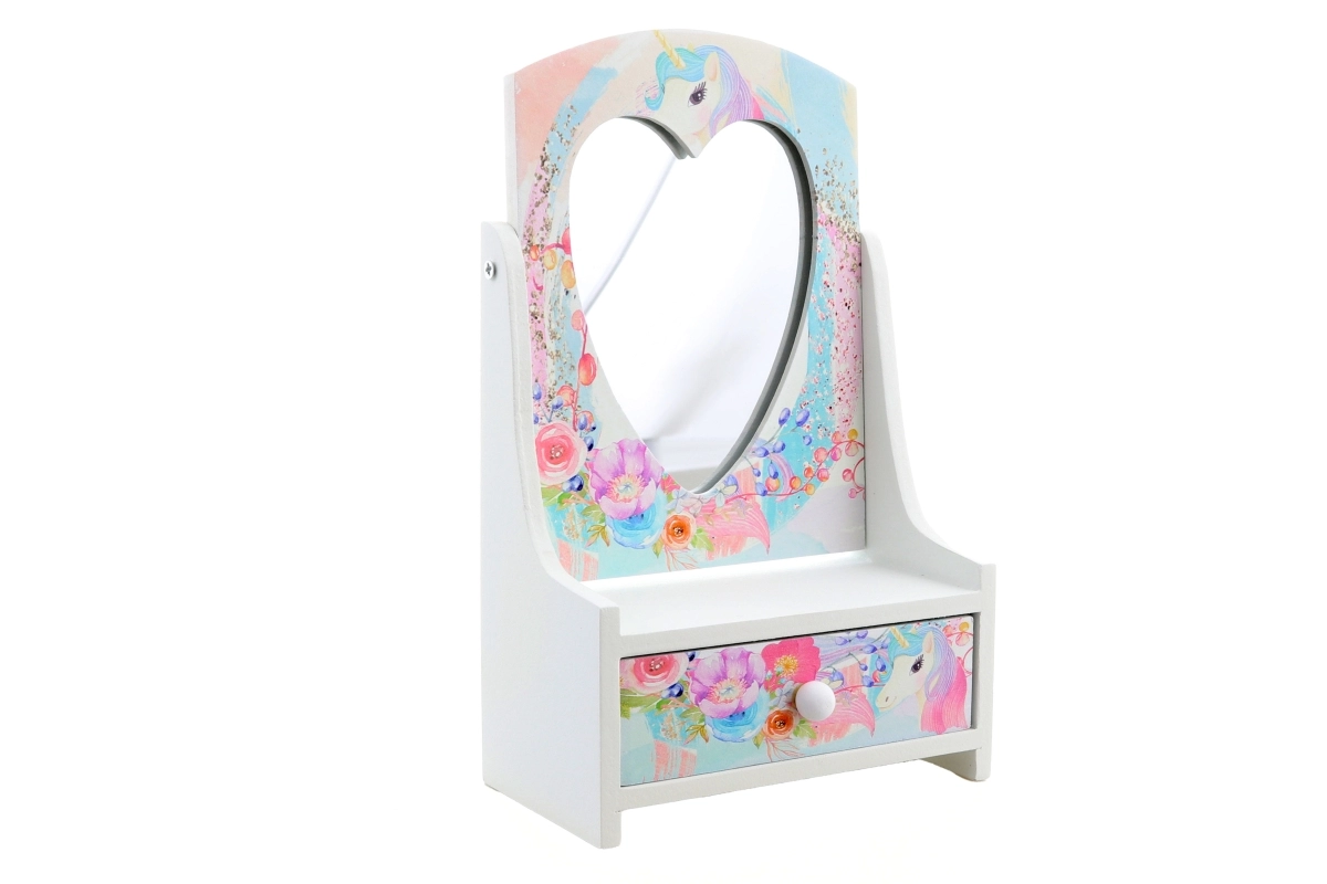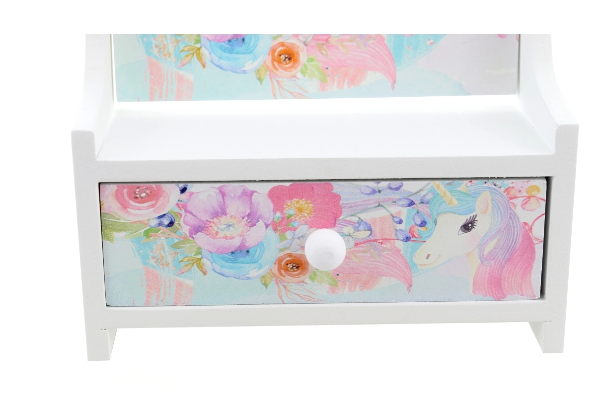Een schattige houten sieradendoos met een kantelbare hartvormige spiegel helpt kinderen hun schatten overzichtelijk op één plek te bewaren. De zachte pastelgekleurde bloemen- en eenhoornmotieven maken het zowel een mooie decoratie voor de kinderkamer als een praktische hulp bij dagelijks kammen en spel.