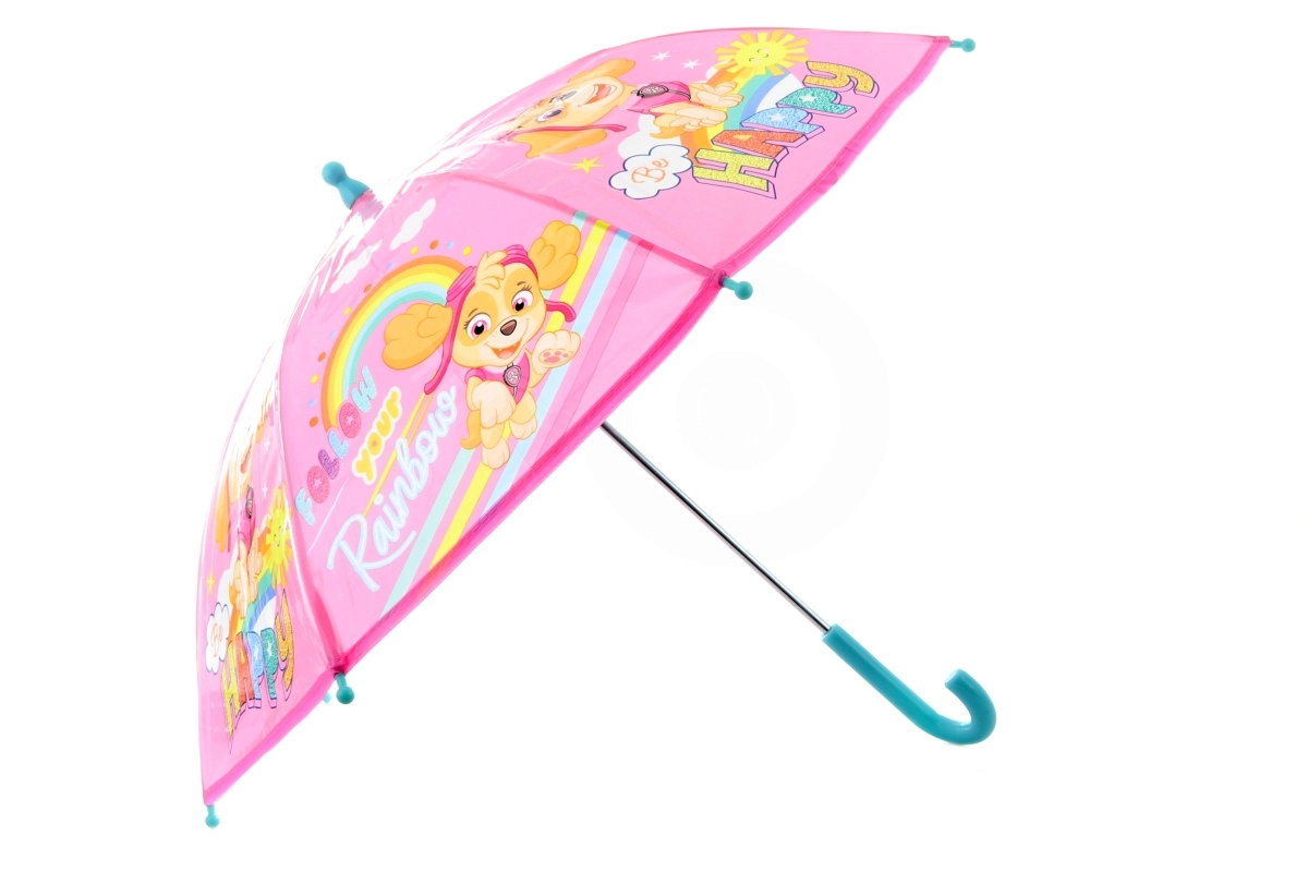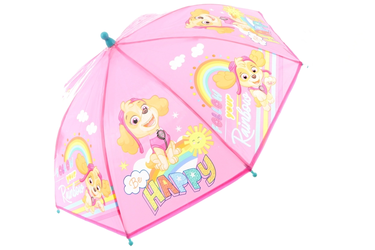 Deze stijlvolle roze paraplu met vrolijke afbeeldingen van puppy’s, regenbogen en teksten als “Be Happy” en “Follow your Rainbow” zal elke jonge fan van PAW PATROL blij maken. Dankzij de koepelvorm biedt hij betrouwbare bescherming tegen regen en ziet hij er tegelijk geweldig uit.