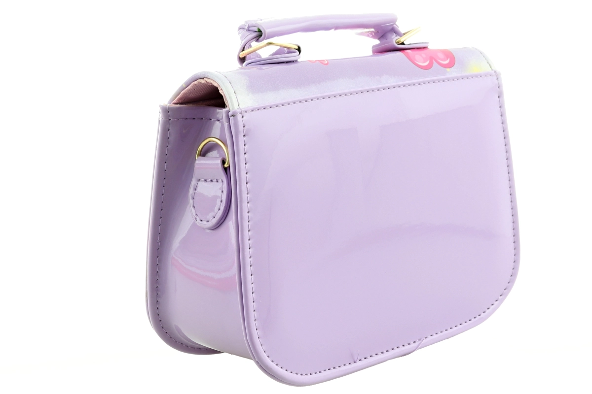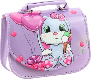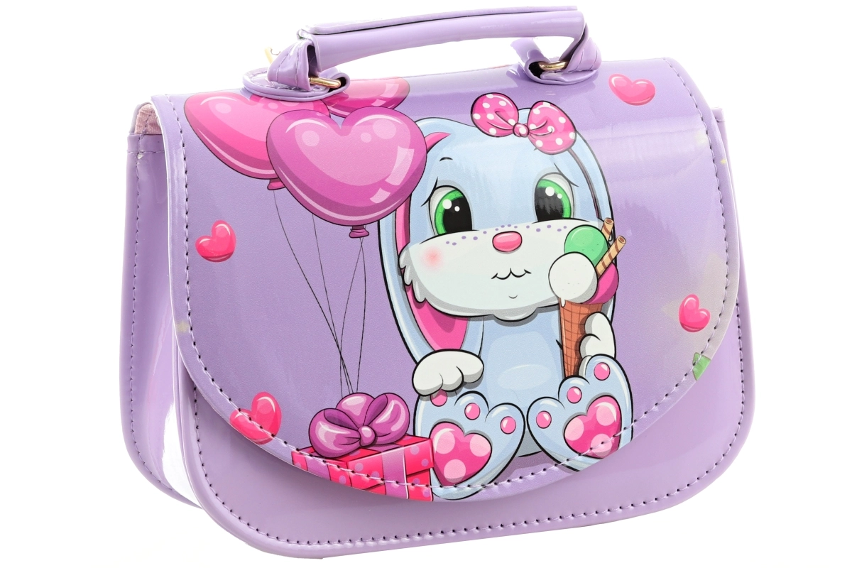 Deze kleine paarse handtas met een schattig konijntje, ballonnen en hartjes valt meteen op. Het glanzende materiaal, de precieze stiksels en de stevige constructie zorgen ervoor dat de tas mooi in vorm blijft en bestand is tegen dagelijks gebruik. Eén overzichtelijk vak en een eenvoudige drukknoopsluiting maken het dagelijks gebruik gemakkelijk.