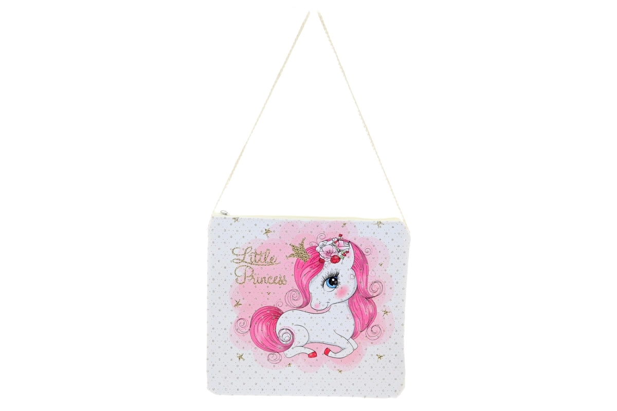 Deze decoratieve handtas met eenhoornmotief valt op door de opvallende glanzende print op de voorkant (kunstleer) en de aangename stoffen afwerking. Ideaal als stijlvol accessoire bij je outfit, voor kleine spullen of als cadeau voor eenhoornliefhebbers.