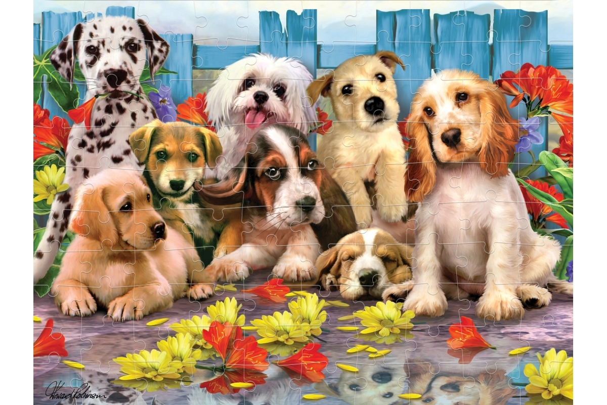 Een kleurrijke illustratie vol puppy’s en bloemen die zowel kinderen als volwassenen aanspreekt en uitnodigt om steeds opnieuw te puzzelen.