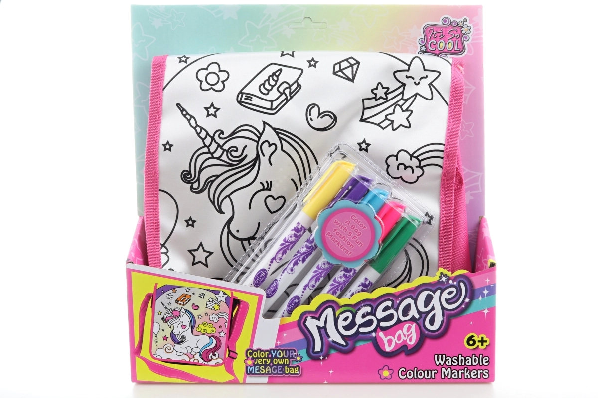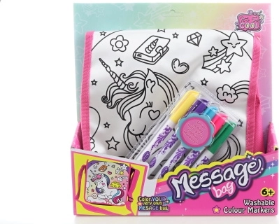 Ontdek het betoverende inkleur-handtasje met eenhoornmotief dat kinderen urenlang creatieve pret biedt. Dankzij de praktische klittenbandsluiting en de roze schouderriem draagt het tasje comfortabel en is het makkelijk te openen. In de verpakking vind je alles wat je nodig hebt – het tasje zelf en 5 kleurtjes, zodat je meteen kunt beginnen.