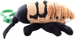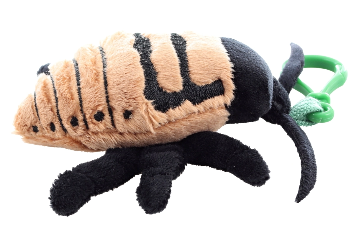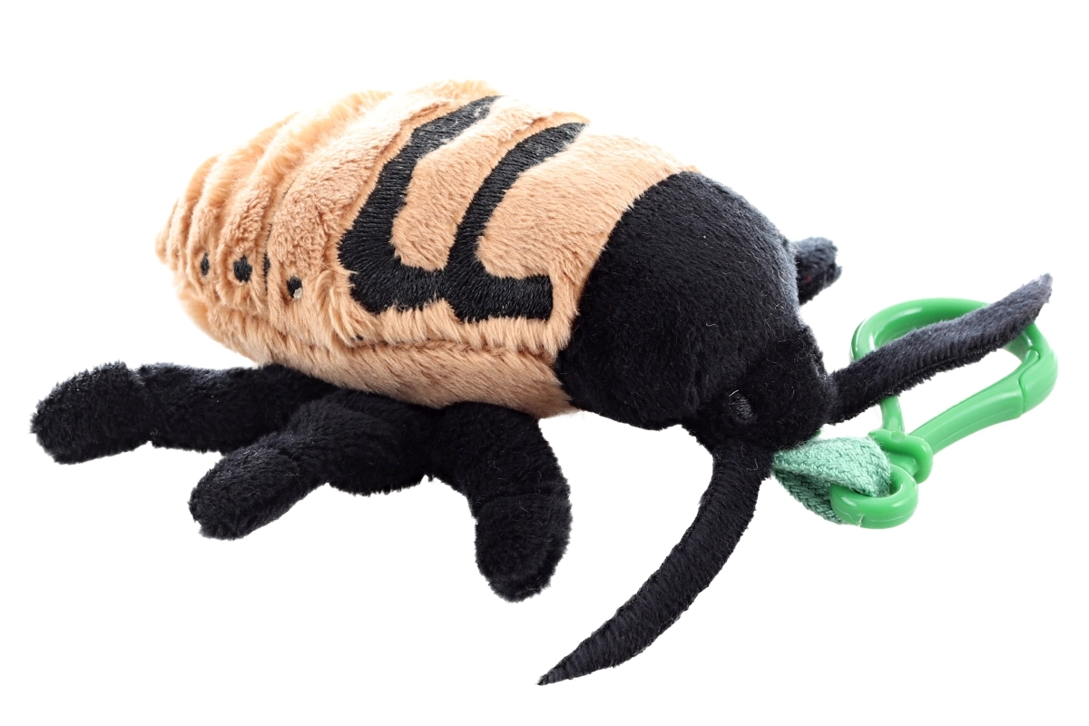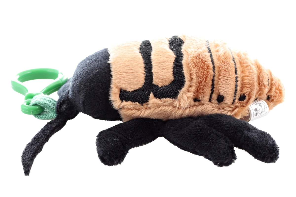 De zachte textuur, contrasterende kleuren en geborduurde patronen op de rug geven de kakkerlak een realistische en tegelijk speels schattige uitstraling.