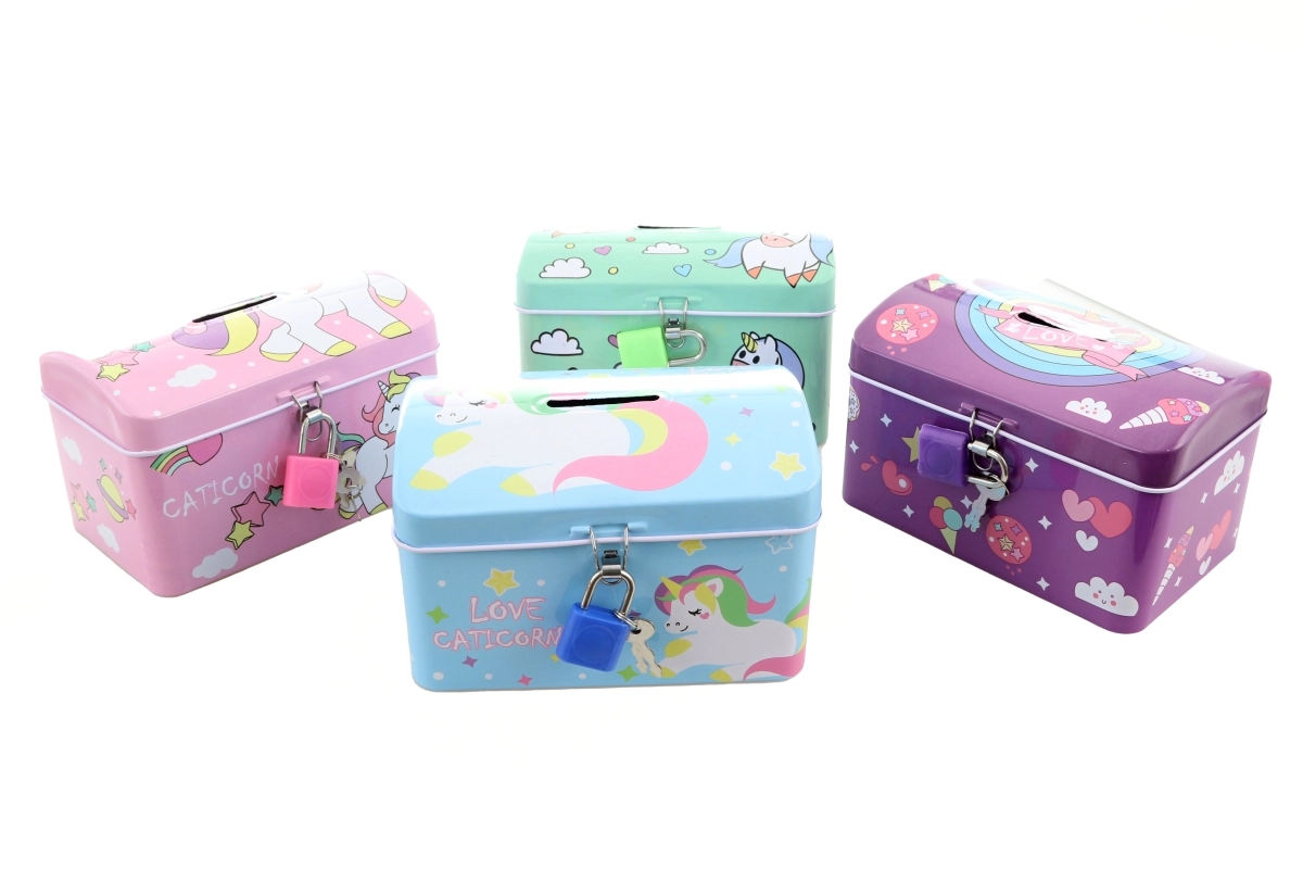 Schattige metalen spaarpot met eenhoorntjesmotief, ideaal voor de eerste spaargeldjes van kinderen. Inclusief een slotje en 2 sleuteltjes voor het veilig opbergen van muntjes en kleine schatten. Dankzij de compacte afmetingen van 13 × 8 × 8 cm en de duurzame uitvoering is dit een geweldig cadeau voor kinderen vanaf 3 jaar.