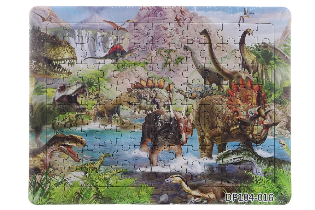 Deze kleurrijke dinosauruspuzzel zal elke kleine liefhebber van de prehistorie blij maken. Dankzij de 104 stukjes oefenen kinderen geduld, concentratie en visuele waarneming, terwijl ze veel plezier beleven aan het ontdekken van details op de voltooide afbeelding.