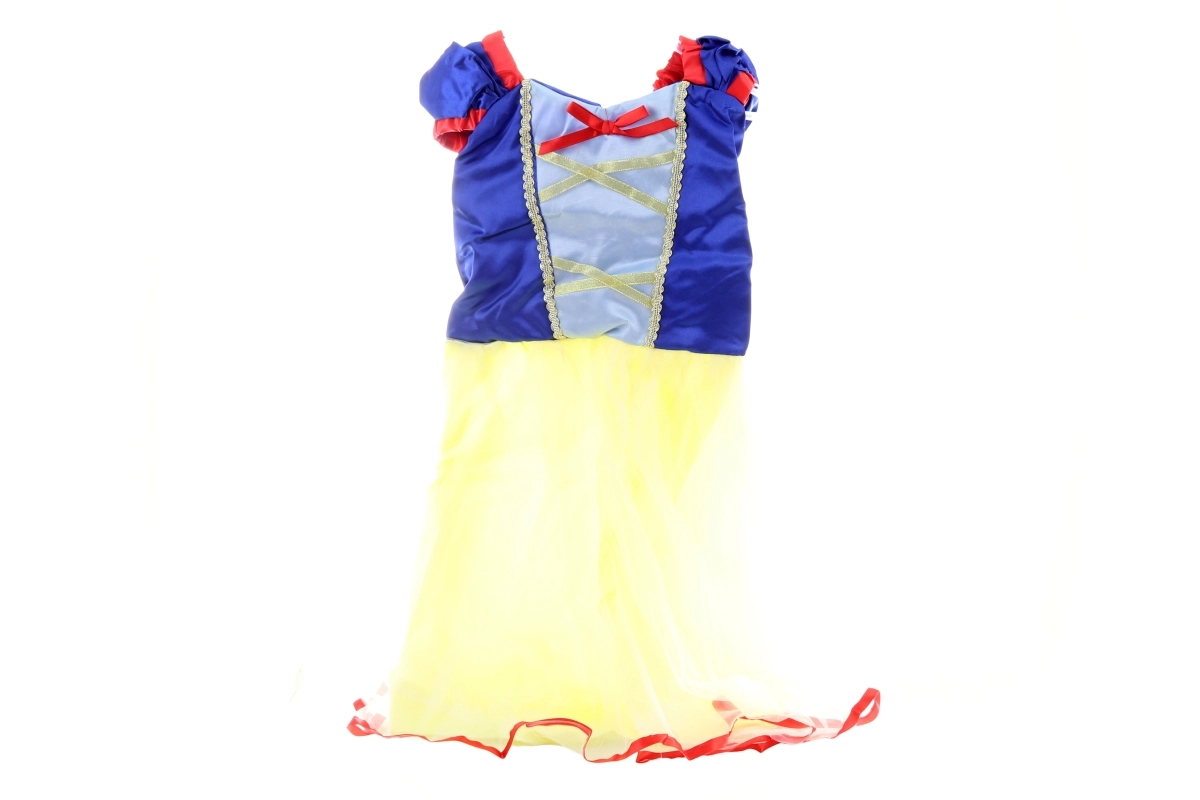 Verander je meisje in een sprookjesprinses! Deze jurk in Sneeuwwitje-stijl valt op door het blauwe lijfje met sierlijke vetering en de lange gele rok met rode zoom. Perfect voor carnaval, kinderfeestjes en verkleden thuis.