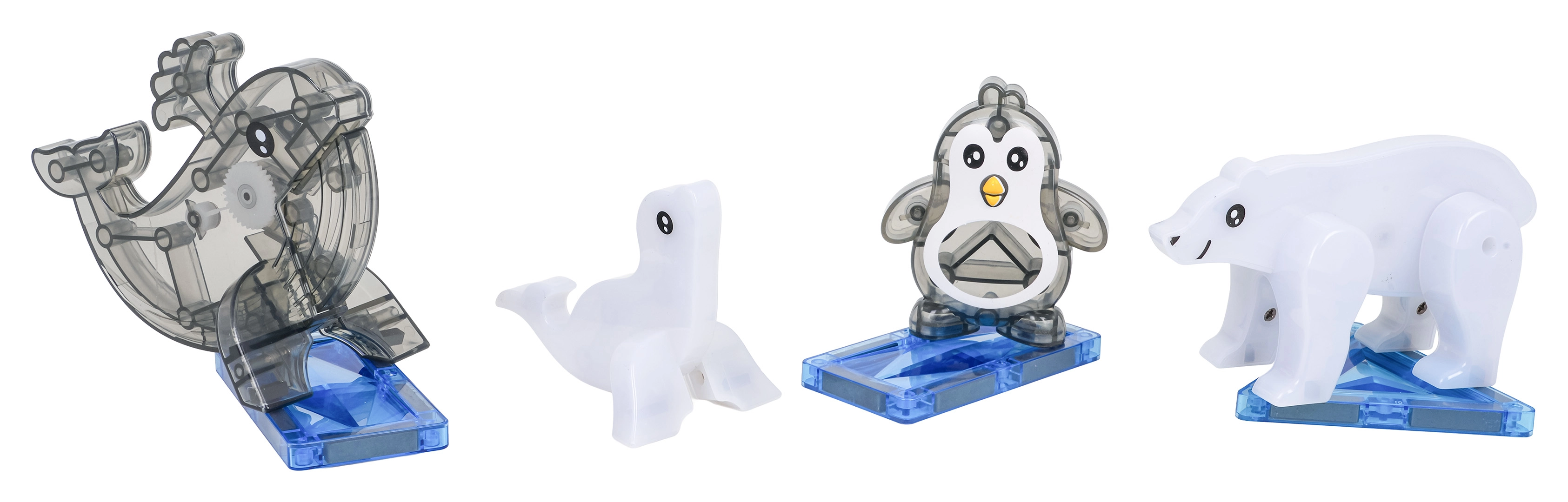 De figuurtjes hebben beweegbare elementen (de dolfijn opent zijn bek, de beer beweegt zijn poten, de pinguïn heft en laat zijn flippers zakken), wat fantasierijke verhalen en fijne motoriek ondersteunt. Onderdelen kunnen onder verschillende hoeken worden gecombineerd om onbeperkte variaties te creëren – van eenvoudige vormen tot complexe 3D-modellen.