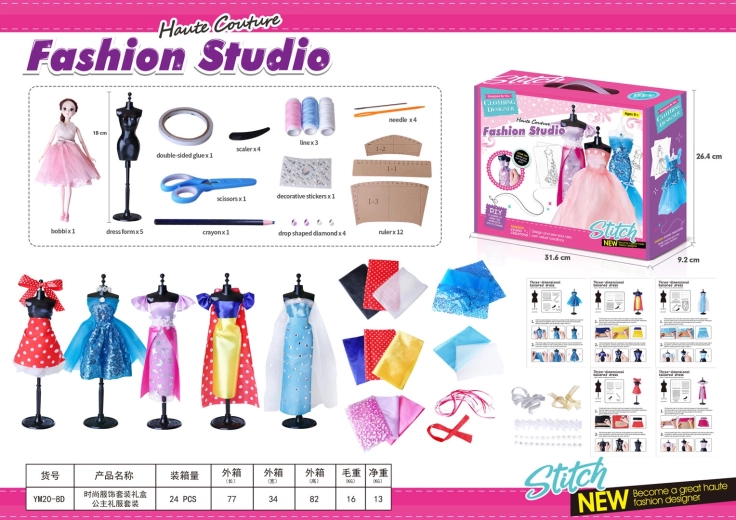 Start je eigen mini-modeatelier! Deze rijk uitgeruste set maakt het kinderen mogelijk hun droommodellen te ontwerpen en om te zetten in echte poppenjurken. Dankzij paspoppen, patronen en diverse materialen kunnen jonge makers eenvoudig alle stappen proberen, van idee tot afgewerkte creatie.