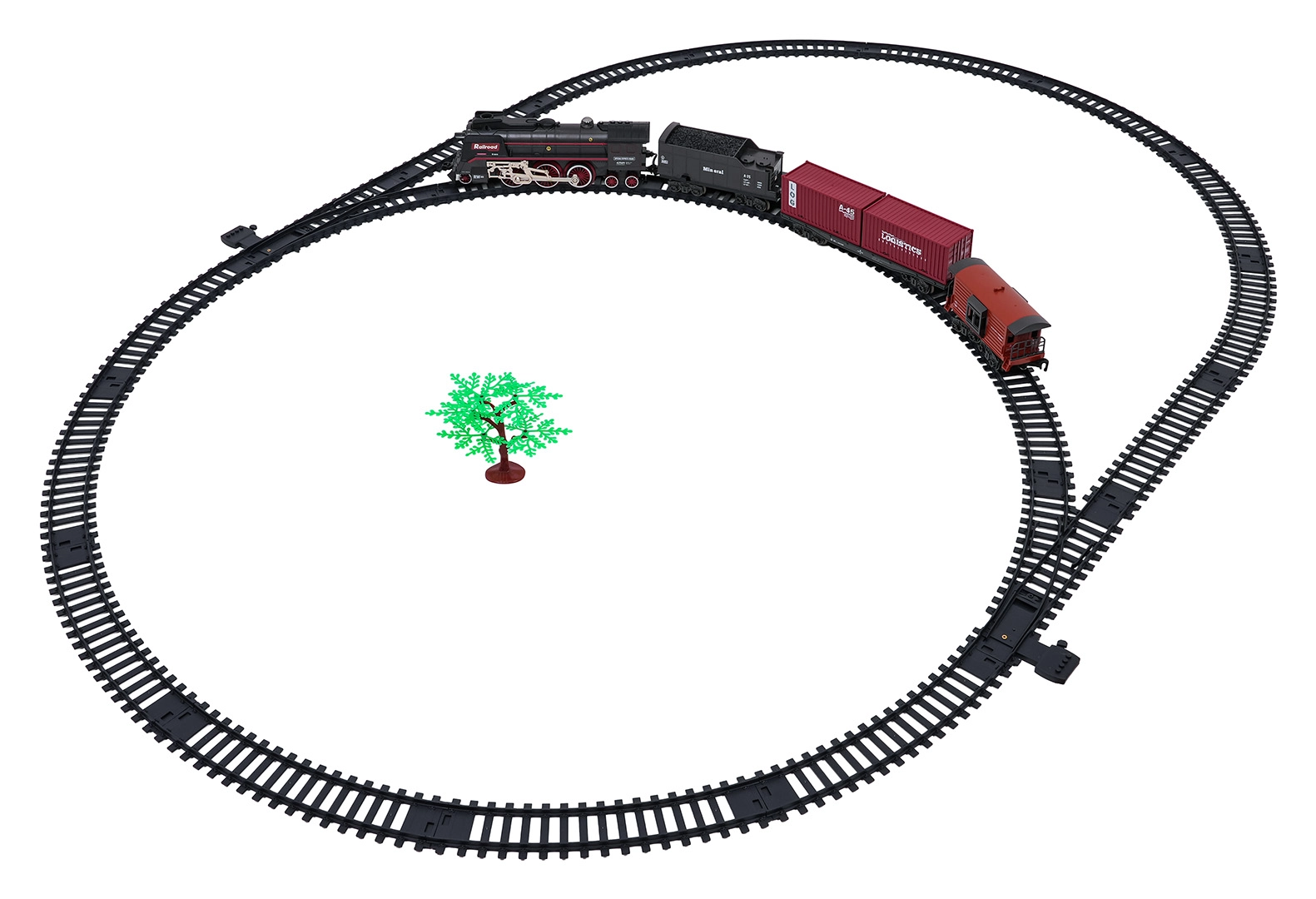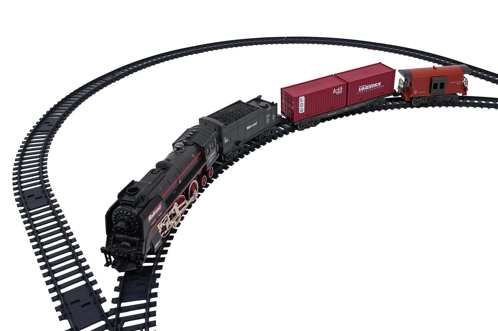 De rails zijn duurzaam, veilig en eenvoudig te koppelen tot een traject van circa 138 × 99 cm. De set bevat een personenrijtuig, een tender met kolen en een containerwagen voor afwisselende speelscenario’s. Voor stiller gebruik kun je de geluiden uitschakelen; de locomotief kan vooruit, achteruit rijden en stoppen.
