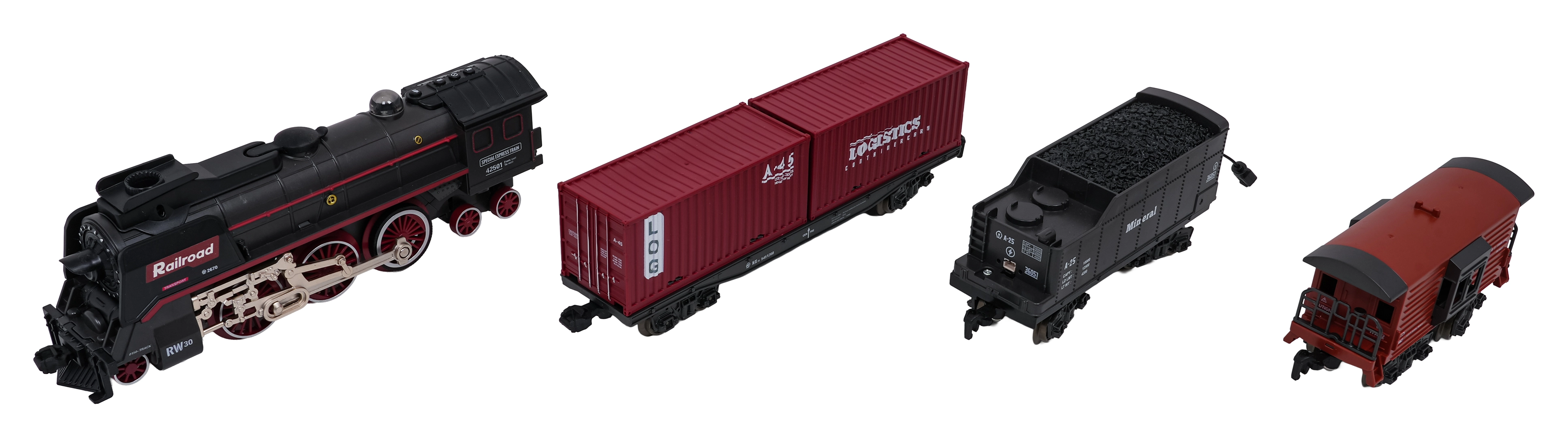 Locomotief, personenrijtuig, tender met kolen, containerwagen, raildelen, schroevendraaier, pipet voor water, accu 3,7 V, USB-oplaadkabel