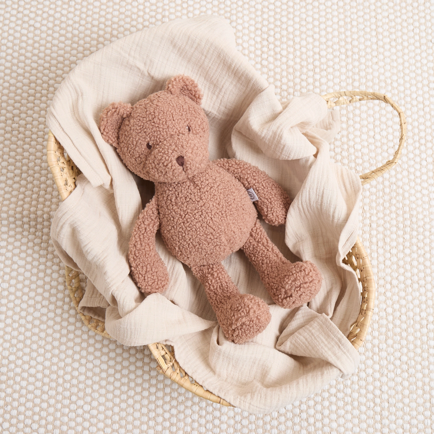 Teddybeer Mika is een klassieke pluchen vriend met een vleugje nostalgie die nooit uit de mode raakt. De luchtige bouclé-stof in chocoladebruin nodigt uit tot knuffelen en de zachte vulling biedt steun tijdens rust en bij het inslapen. Dankzij de langere, los hangende ledematen is hij heerlijk soepel en nestelt hij zich comfortabel in je armen.