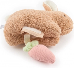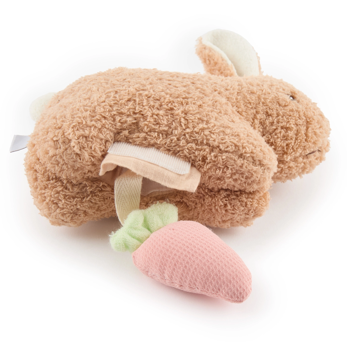 Het uitneembare worteltje in het buikje van het konijntje knispert zachtjes bij het indrukken en motiveert je baby om te ontdekken, vast te pakken en steeds opnieuw te verkennen.