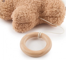 Het fluweelzachte oppervlak nodigt uit tot knuffelen en de gladde houten ring ligt goed in kleine handjes en is prettig om aan te trekken.