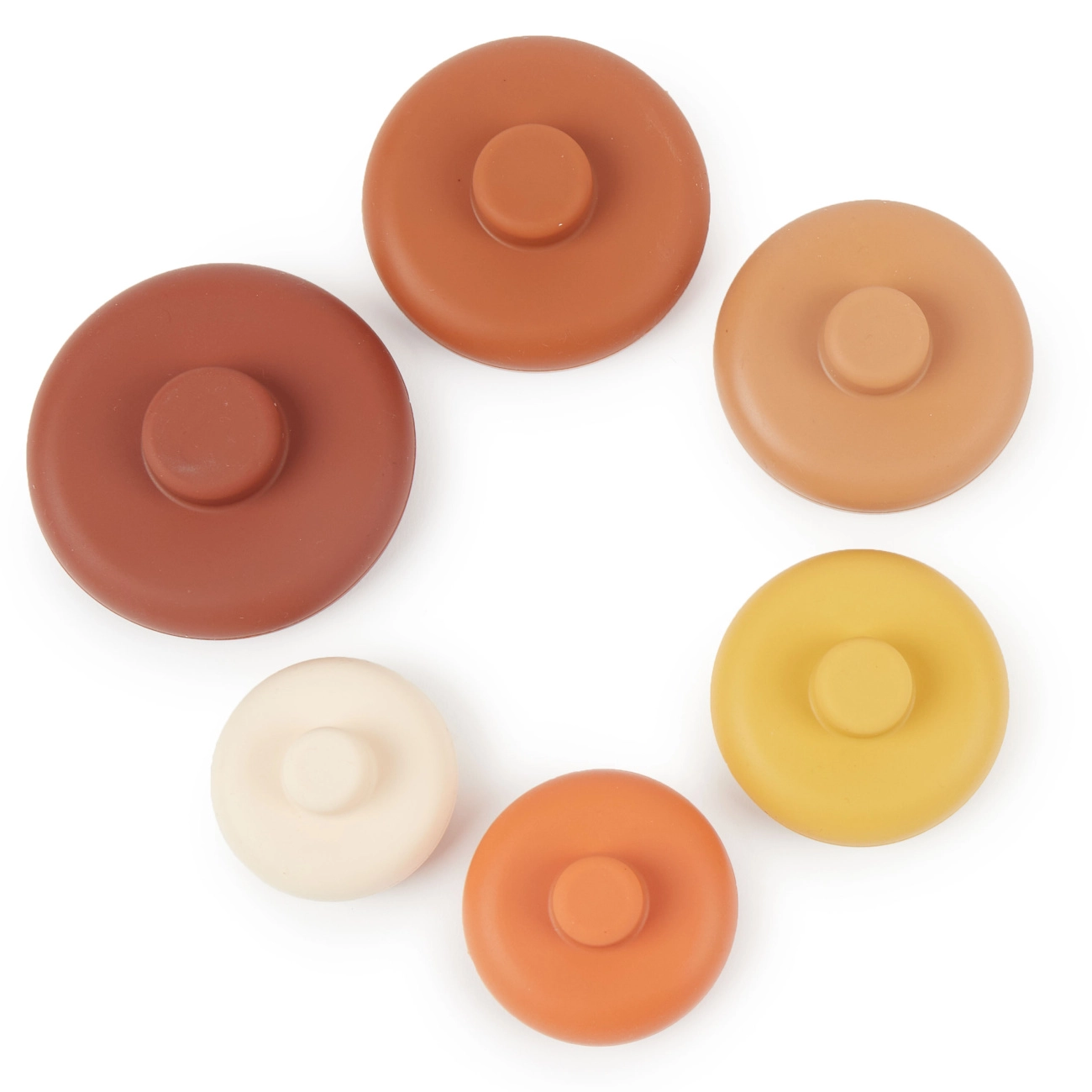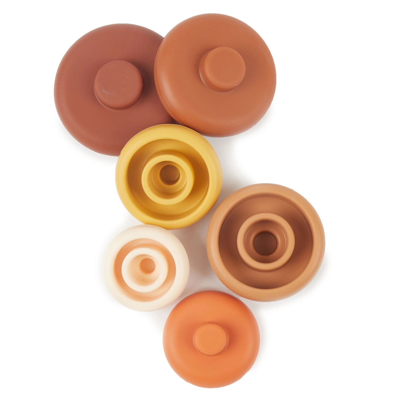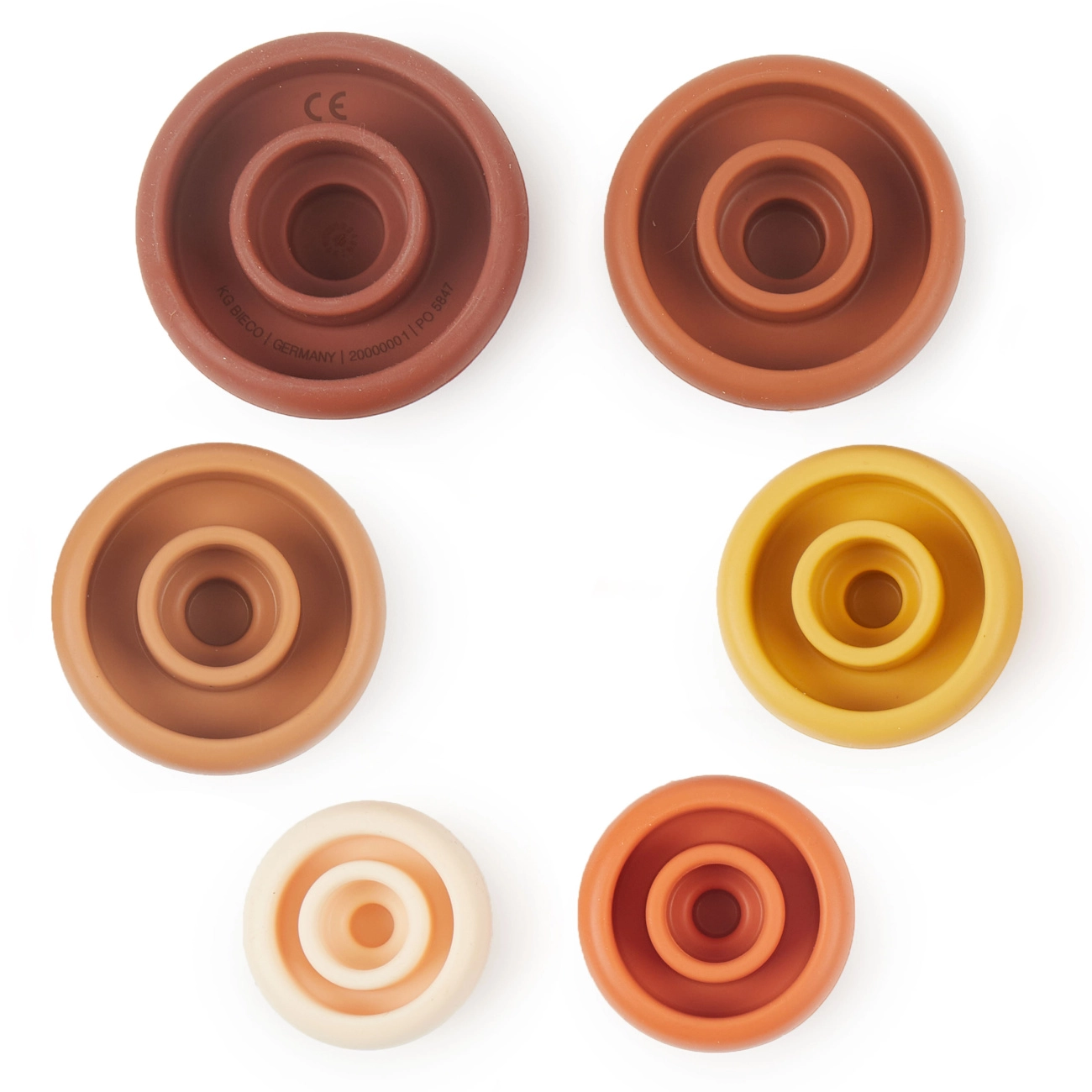 Deze 6-delige siliconen stapeltoren Bieco Chocolate Bliss biedt kinderen eindeloze mogelijkheden om te bouwen, sorteren en ontdekken. Het zachte maar stevige materiaal voelt prettig aan, is antislip en gemakkelijk schoon te maken – ideaal voor dagelijks spelen thuis, buiten en in het water.
