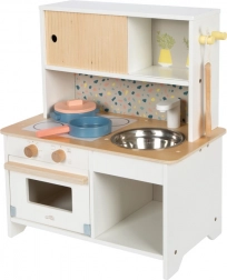 Dit stijlvolle witte keukentje met natuurlijke houtaccenten en een speelse achterwand in terrazzo-patroon stimuleert creatief rollenspel, de ontwikkeling van fijne motoriek en sociale vaardigheden. De compacte afmetingen besparen ruimte, ideaal voor kleinere kamers of als tweede keukentje bij opa en oma.