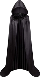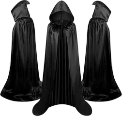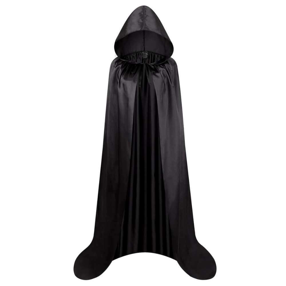 Zoek je een eenvoudige manier om je kostuum voor Halloween, carnaval of een themafeest af te maken? Deze zwarte mantel met capuchon van lichte synthetische stof valt elegant, zit prettig op het lichaam en is met een lengte van 180 cm (zonder capuchon) geschikt voor volwassenen en oudere kinderen.