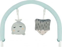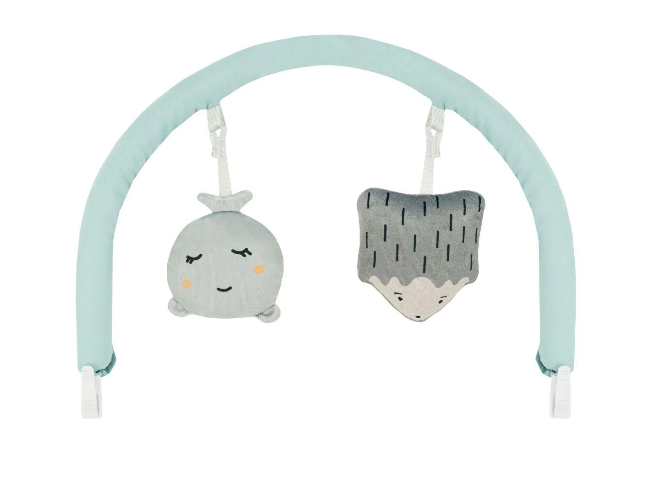 De afneembare speelboog met twee zachte speeltjes stimuleert visuele tracking, grijpen en hand-oogcoördinatie.