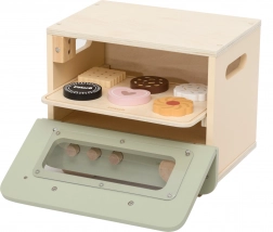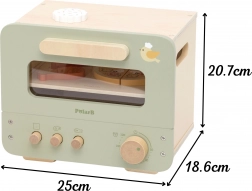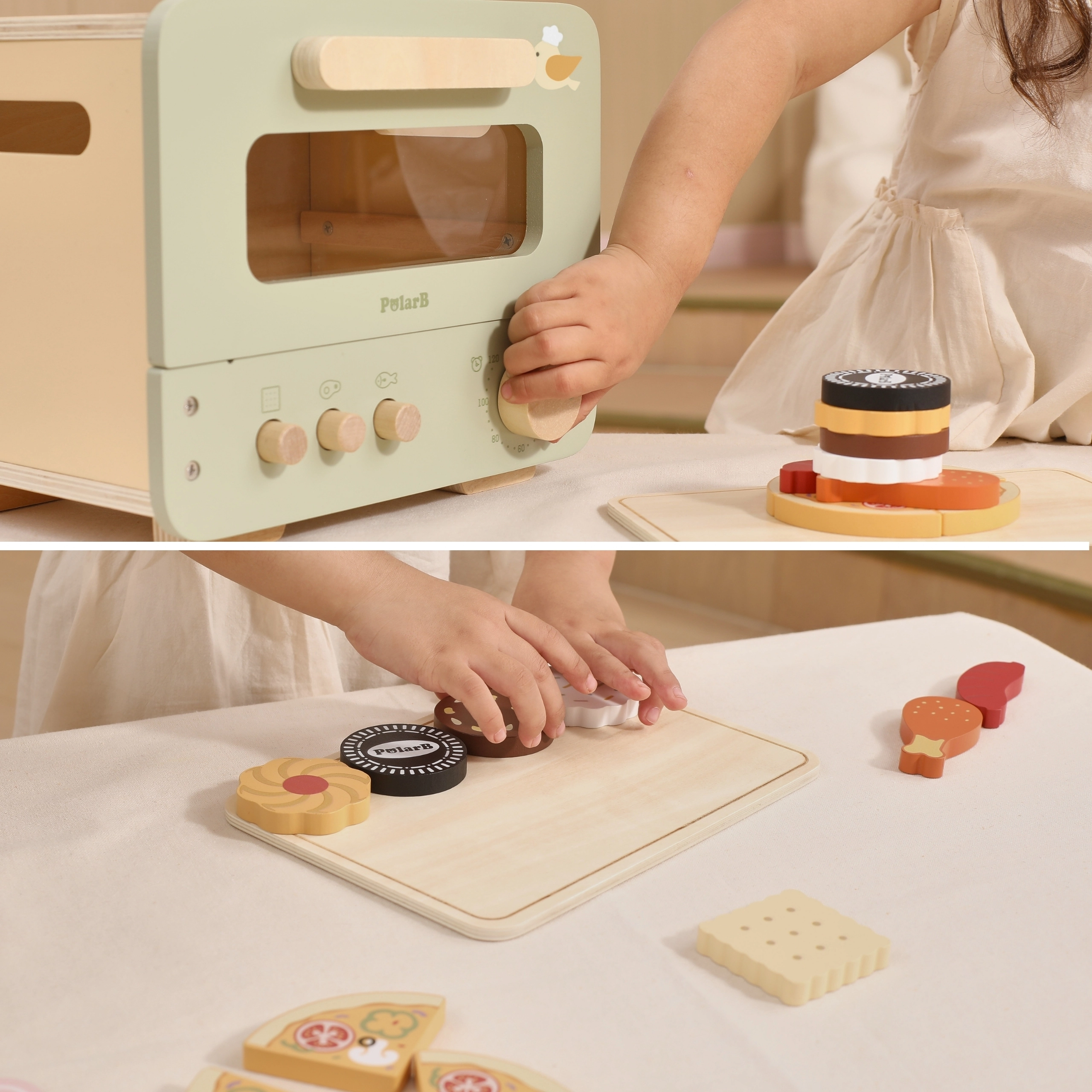Deze stijlvolle kinderoven in groen-beige uitvoering biedt kinderen een authentieke bakervaring. Het transparante raampje, de functionele knoppen en de afneembare bakplaat nodigen uit tot creatief serveren van zoete en hartige lekkernijen. Kinderen kunnen de mini pizza snijden en samenstellen, koekjes bakken en tegelijk hun behendigheid en communicatie trainen tijdens rollenspel.