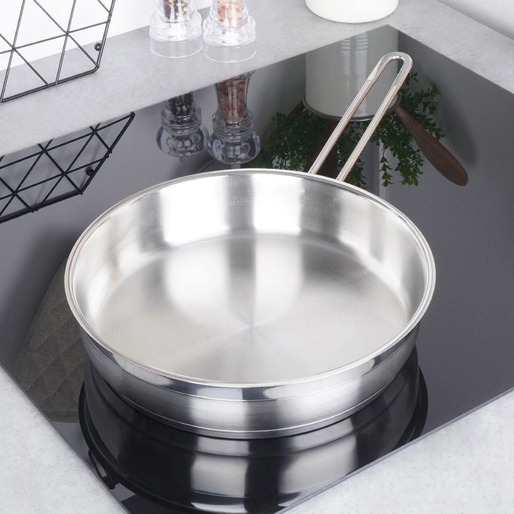 Deze roestvrijstalen pan met tijdloze uitstraling is een uitstekende keuze voor vlees, groenten en pannenkoeken. Gemaakt van hoogwaardige roestvrijstalen met matte afwerking en een elegante glanzende bies aan de bovenzijde, voor een lange levensduur en corrosiebestendigheid. Massieve wanden en een stabiele constructie zorgen voor een gelijkmatige warmteverdeling en betrouwbare prestaties bij bakken en sauteren.